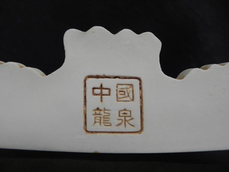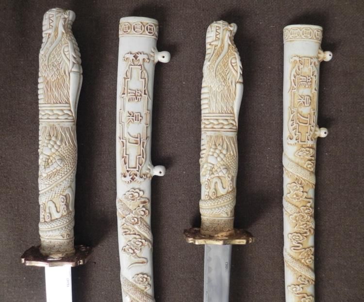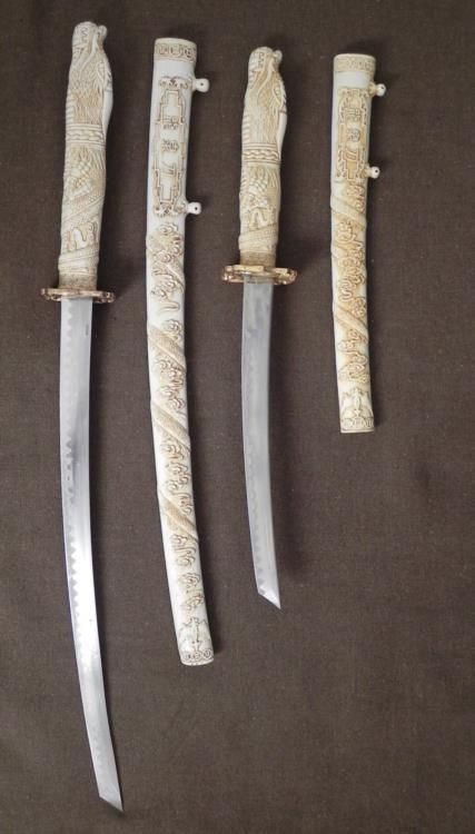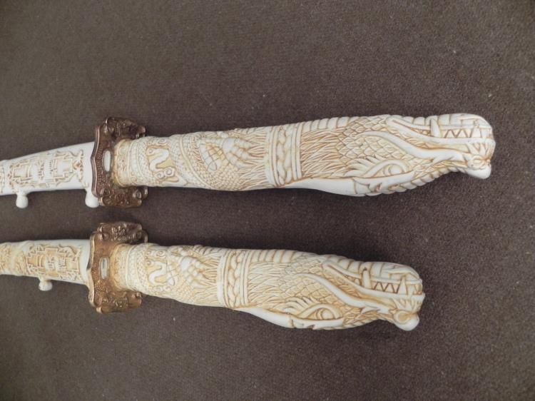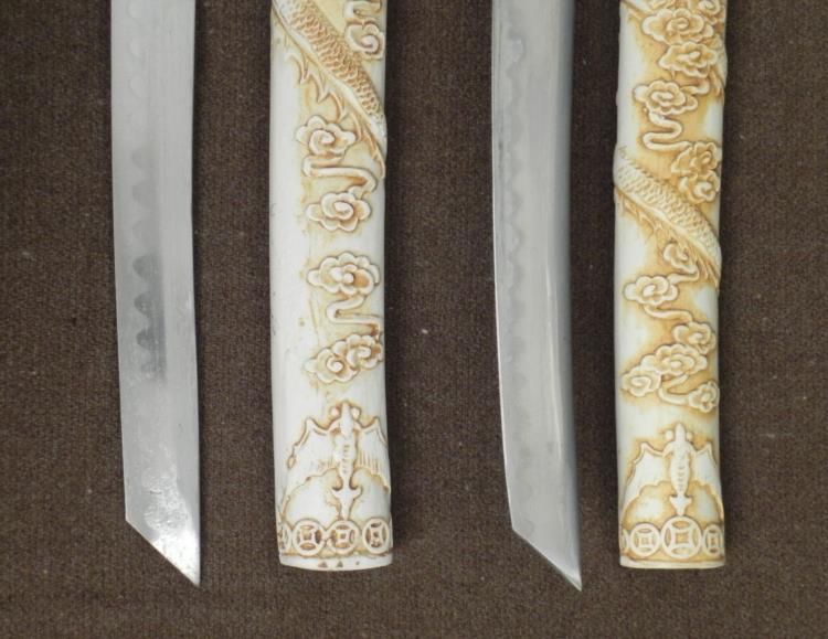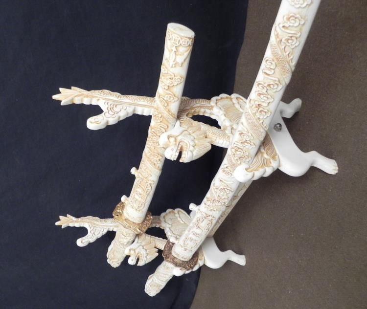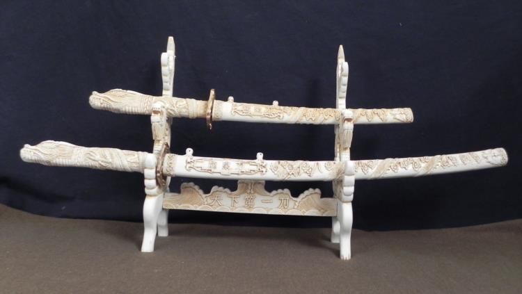 JAPANESE SAMURAI SWORDS-WAKAZASHI & TONTO W/STAND-ORNATE DRAGONS OUTSTANDINGLY BEAUTIFUL JAPANESE TYPE SAMURAI SWORDS WITH MATCHING DISPLAY STAND--BOTH SWORDS AND STAND ARE A FAUX AGED IVORY--SPECTACULAR DRAGON/REPTILE GRIPS AND MOTIF-KANJI SCROLLED ON BOTH--THE TONTO BLADE IS 11 7/8" IN LENGTH AND THE LENGTH OF THE BLADE ON WAKAZASHI IS 19".--GOLD TONED TSUBAS-ALL ITEMS ARE VINTAGE CHINESE ASIAN MADE WITH GREAT DETAIL REPLICATING SWORDS OF HUNDREDS OF YEARS AGO.--THE STAND IS VERY ORNATE WITH THE SAME DRAGON/SERPENT DESIGN--HORIZONTAL PORTION HAS A KANJI STAMP--A GREAT DISPLAY OF ARTESTRY FOR YOUR COLLECTION ROOM