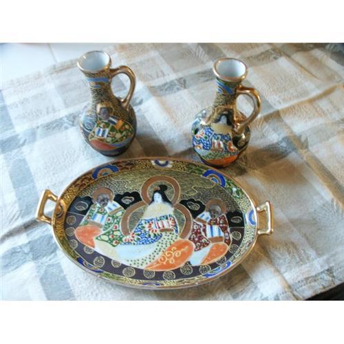 VERY NICE HAND PAINTED PORCELAIN SAKE SET : 2 BOTTLES AND A TRAY. BEAUTIFUL COLORS AND 24K GOLD. MY FRIEND'S GRANDMOTHER BROUGHT IT FROM JAPAN IN 1962.