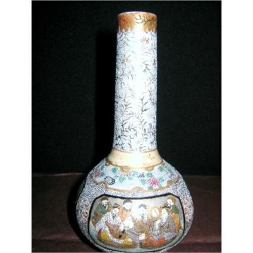 WONDERFUL SATSUMA CABINET VASE. THE WORKMANSHIP IS EXTREMLEY DELICATE AND PRECISED.THERE ARE THREE DIFFERENT CARTOUCHES(SCENES) ON THE LOWER BODY OF THE PIECE. THE WHITE DESIGN IS APPLIED IN A DOT PATTERN.THIS IS A VERY NICE PIECE OF SATSUMA, ALTHOUGH IT IS NOT SIGNED. BUT CLEARLY DONE BY A MASTERFULL HAND.