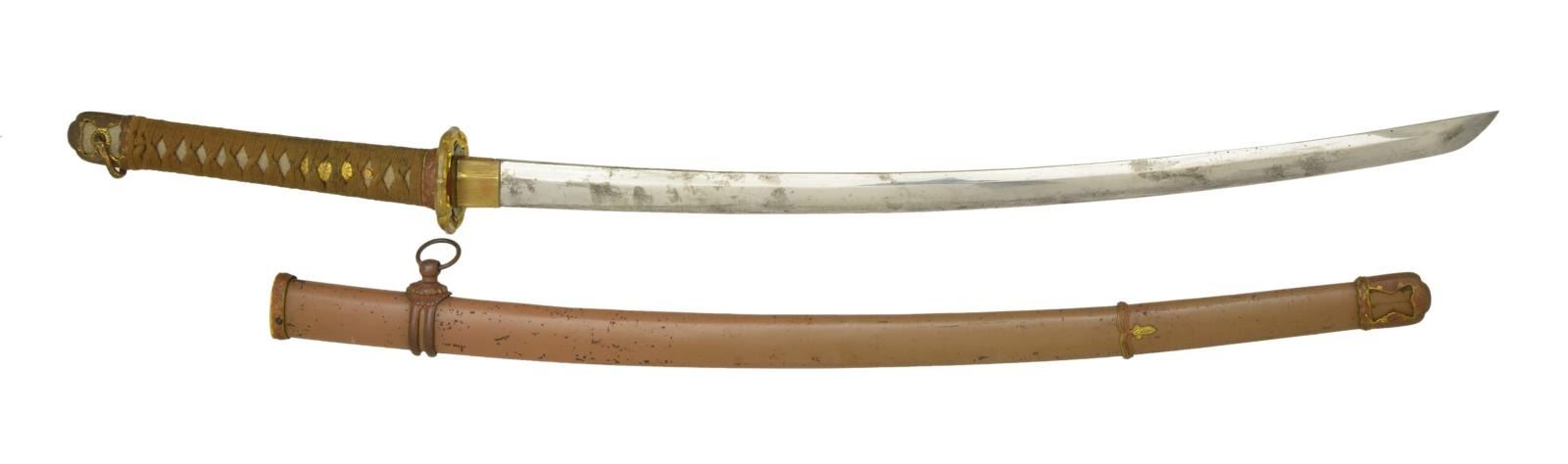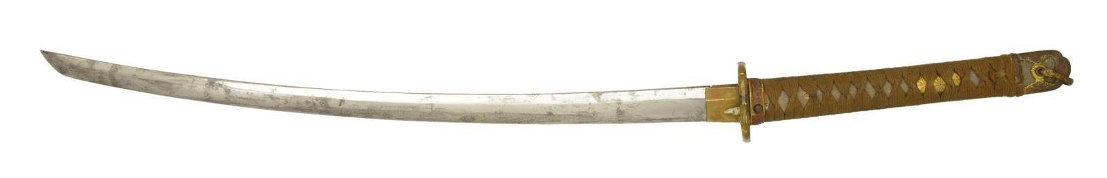 Overall length: 38 1/2". Blade length: 25 5/8". Blade appears to have a straight hamon however it is difficult to discern because of improper sharpening. Gilded brass habaki. Classic gilded brass tsuba w/ 4 cherry blossoms on each side. There are 2 seppa above & below the tsuba. Nakago has a single mekugi-ano & has a 5 character signature on 1 side & a 6 character signature on the opposite side. Matching fuchi & kabuto-gane. Brown tsuka ito w/ white same & 2 gilded brass 3 cherry blossom menuki. Military style saya has a cocoa brown finished body w/ gilt highlighted brass mounts. CONDITION: blade has notable darkened areas & has been improperly sharpened. There are no edge nicks or delaminations noted. Tsuka shows generally light wear as does the saya. PROVENANCE: Estate Collection of Jack Verret Sr. (02-17413/BF). $500-800.