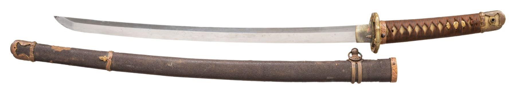 A nice shin-gunto wakizashi measuring 36 1/2" overall with a 21 1/2" blade. Blade has a wavy hamon and a gilded copper habaki. The nakago has a single mekugi-ana and an 8 character signature on one side. The gilded brass tsuba has a classic 4 cherry blossom design on both sides with 4 seppa above and 4 seppa below. Matching fuchi and kabuto-gane. Brown tsuka-ito with white same and gilded 3 cherry blossom menuki. Textured black skin covered saya with matching gunto. CONDITION. blade has a very nice polish. Tsuka shows light to moderate wear and the saya shows more extensive wear. (02-24102/BF). NON-GUN. $400-600.