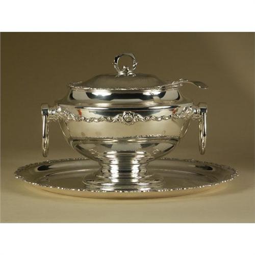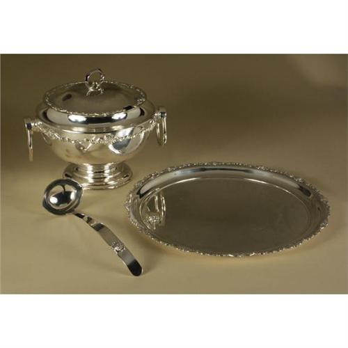 SILVER PLATE: A single lot of silver plate having a round tray 13.75'' with a footed double-handled soup tureen, 8'' x 10'' to outside of the handles, lid and serving ladle, all matching with clear surface areas except for a thin floral gadroon style lip on the tray, tureen and lid, Japan. Note: condition reflects nearly new condition with only minor surface marks on the tray.