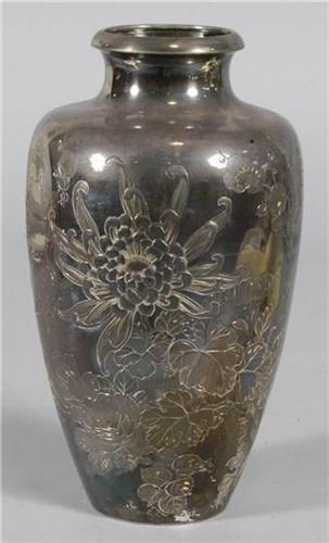JAPANESE SILVER VASE with floral designs 12" high, 6" diameter 35 troy ounces circa 1890, CONDITION: flattened indentation about 2"x1" just below shoulder, PACKING AND SHIPPING BY FAIRFIELD AUCTION WITHIN CONTINENTAL USA (excluding insurance) $30,