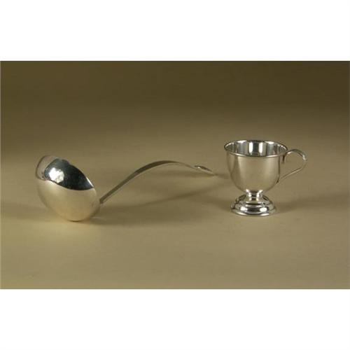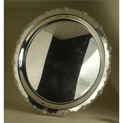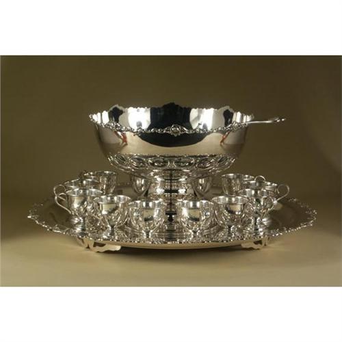 SILVER PLATE: A nickel silver plated punch bowl set consisting of a footed silver plated punch bowl 12'' x 8.25'', matching round tray 21.5'', and 12 matching rolled-edge footed punch cups with handles, two punch labels, one which does not match. The set has a slim gadroon lip featuring a scroll floral design. The cups have no decoration, hallmarked ''Japan'' on some pieces. Note: Minor surface rub marks on the tray.
