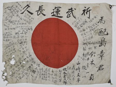 Japanese national flag, 27" along the hoist, 38" along the fly, silk with triangular leather corners and supporting strings fitted thereto. The flag is covered with Japanese writing in black ink, untranslated, but as in almost all cases these were wishes of good luck or patriotic sentiments written by friends and family before the flag was given to the soldier to carry into battle. Tattered a bit at extreme right side, likely from ink erosion, a few small holes, still overall very good.