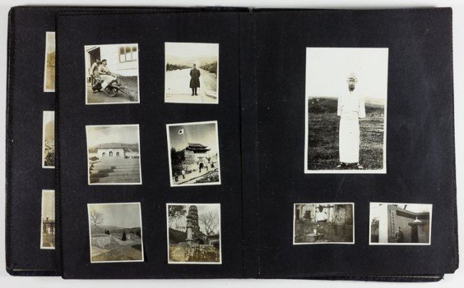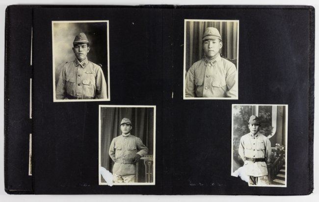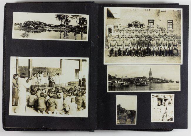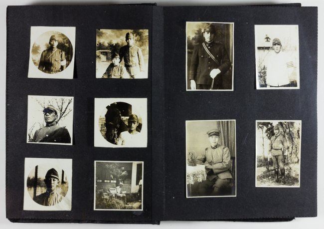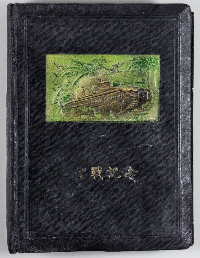 Japanese soldier's photograph album, 7 ?" x 10 ?" with a color embossed image of a tank on the cover. Within are about 150 photos of various sizes, average about 1 ?" x 2 ?", likely taken during the occupation of Manchuria. Images include a tank rolling in the streets, a town burning in the distance, headquarters, fellow soldiers and officers, group photographs, etc. but lacking any combat photos.