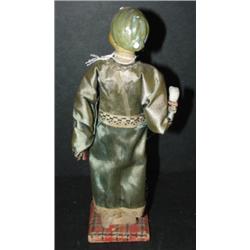 JAPANESE STANDING DOLL in authentic Japanese clothing. Composition head. Small amount of damage to top of head. 8.75" H