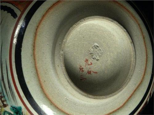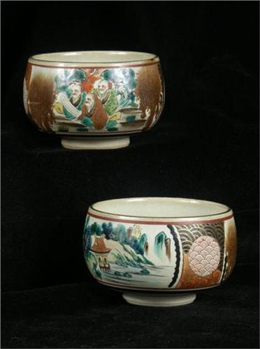 POTTERY: Pair Japanese stoneware teacups with Rakan and village scenes at side panels, signed in red at underside. Early 20th c., Meiji period (1868-1912).