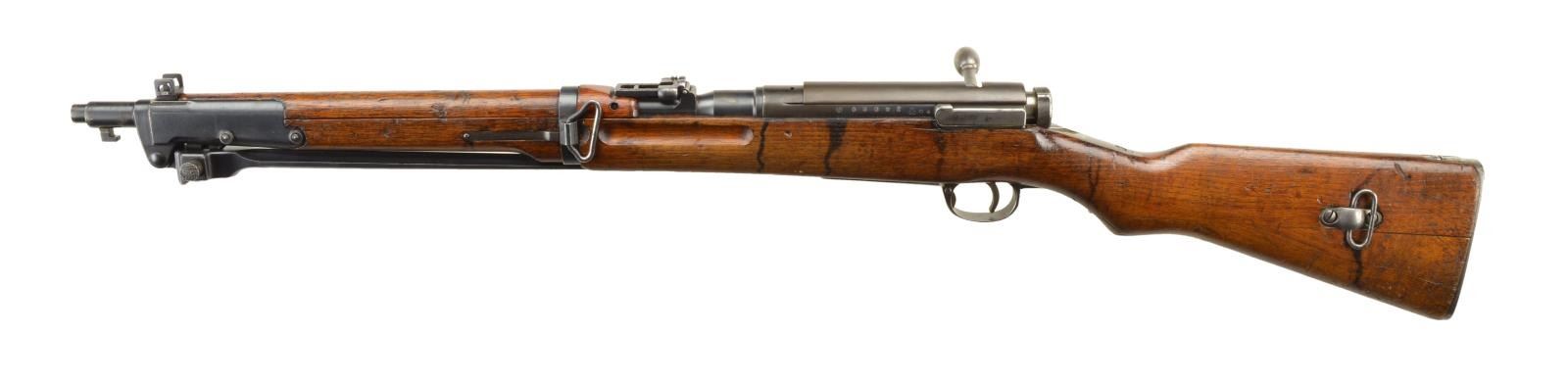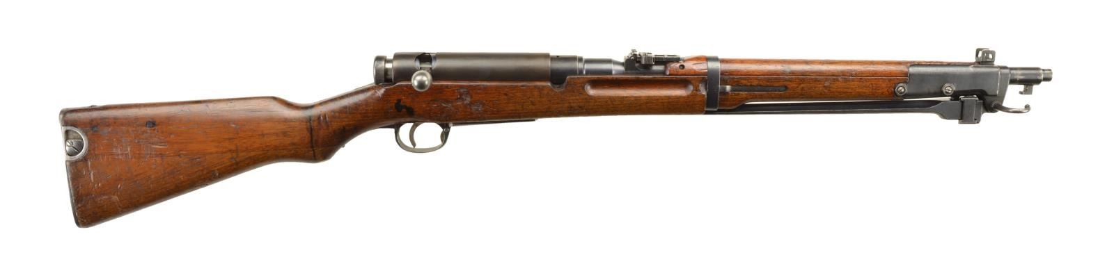 Cal. 6.5 Jap. S #04492. All visible parts match by serial number or proper assembly number except for dust cover. Left side of receiver is marked with a first series marking, the S # and Kokura arsenal symbol. Receiver top has a ground mum and Japanese numbers denoting Type "44". Straight bolt handle with oval knob. Checkered sm. tang safety. Ladder rear sight graduated to 2000 meters. Inverted V front sight w/ protective ears. Third model bayonet housing.13.5" folding bayonet. Hardwood stock set w/ 2 piece buttstock construction and trap buttplate. Stock shows faint Kanji markings. CONDITION: stock retains much original finish with some black finish runs, a 4" crack on left side of butt, a few gouges, shallow chip behind lower tang, scattered dings and handling marks. Dust cover has a fading reblue finish with scattered light pitting. Top of receiver shows some touch up blue where mum was. Metal otherwise retains 60% original blue with bottom metal turning to a silver patina showing scattered oxidation and light pitting. Barreled action shows some fading, high edge wear and light oxidation. Buttplate is a silvery-gray patina with scattered oxidation. Good bore showing some frosting and light pitting. (22-2580/MJC). CURIO. $400-600.