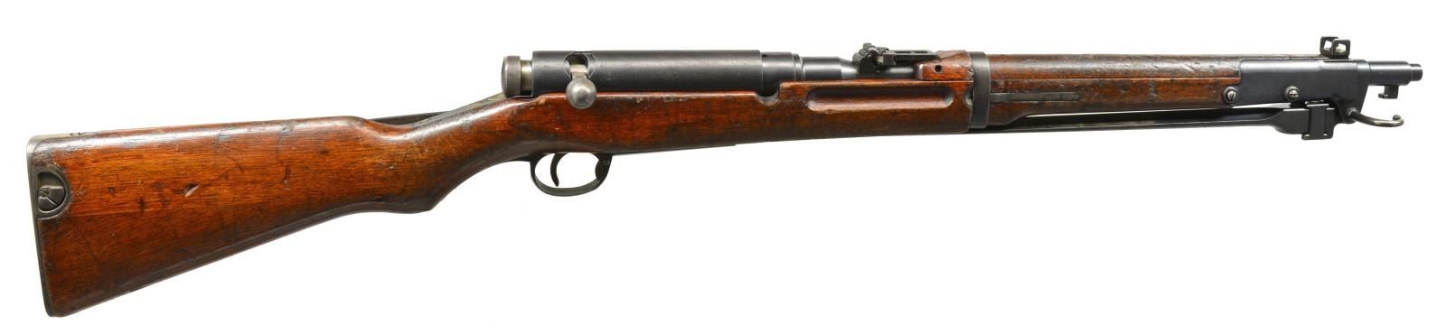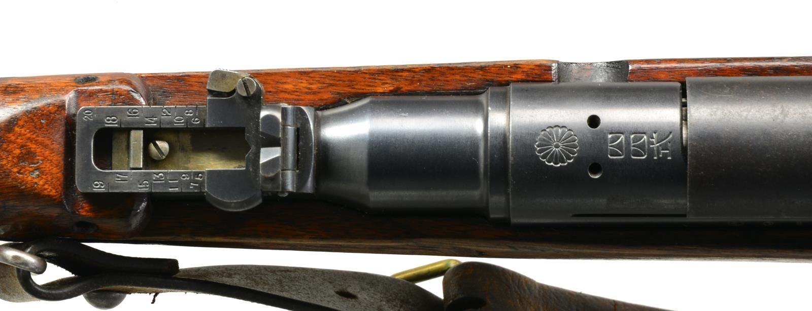 BAYONET. Cal. 6.5 Jap. S# 01090. Bbl. 19". S# matches on receiver & bolt body. Very good example of Japanese Type 44 Cavalry carbine. Left receiver rail is marked w/ interlocking circles of Kokura arsenal. Receiver ring has crisp mum & characters for “44 Type” in Japanese. Straight bolt handle w/ oval knob. Checkered sm. tang safety. Ladder rear sight graduated to 2000m. Inverted V front sight w/ protective ears. Long 3rd variation bayonet housing. 13.5" blade folding bayonet. Correct style sheet metal dust cover. Hardwood stock set w/ 2 piece buttstock construction. Buttplate has trap for cleaning rod which is not present. Correct period unmarked leather sling. Sliding keeper appears to be replacement. CONDITION: stock set shows moderate wear, dents, scratches & staining throughout commensurate w/ extensive service. Metal retains 75% original blue finish w/ thinning & light wear. Bolt is bright. Very good, shiny bore. (20-1934/RW). CURIO. $1,000-1,500.