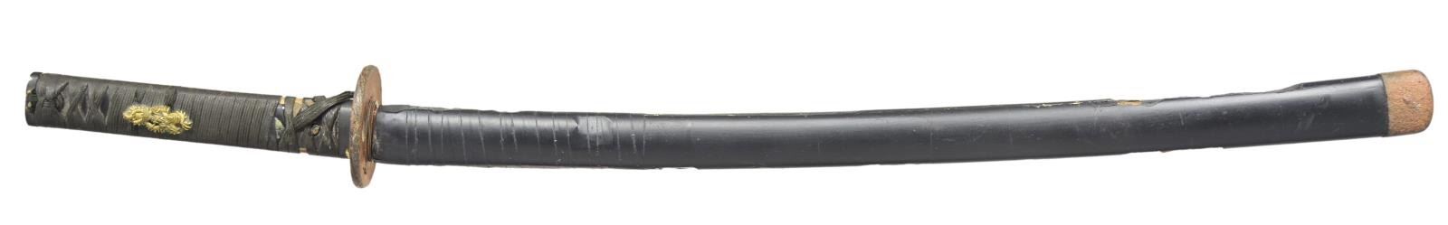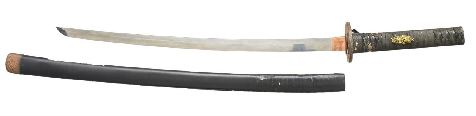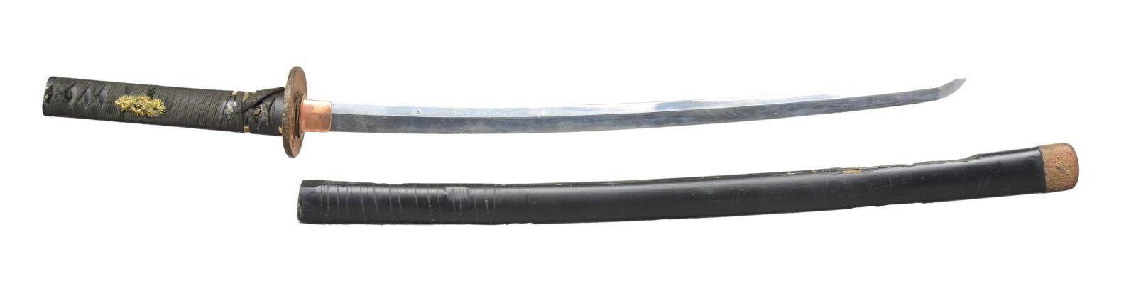 Overall length 34". Blade length 22". Blade has an irregular hamon and does show some flaws in the metal. Copper habaki. There are 4 seppa between the habaki and the tsuba. It appears that the fuchi and 1 seppa have been epoxied to the tsuba. Tsuba is iron with a simple incised motif. The nekago has a 7 character signature and a single mekugi-ana. The fuchi & kashira do not appear to match. The gilded brass dragon menuki are glued over the black tsuka-ito. Wood saya with black finish and a cricket at the tip. CONDITION: blade has a nice polish but does show some irregularities to the edge. Tsuba is quite oxidized. Tsuka-ito is incomplete. Saya has been repainted and reinforced with electrical tape. (02-17990/BF). $200-400.