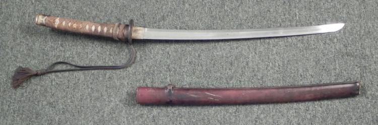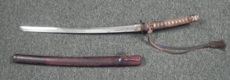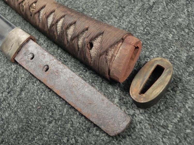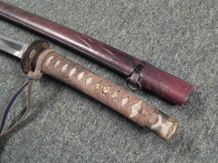 JAPANESE WAKIZASHI SAMURAI SWORD-400 YEARS OLD-ORIGINAL-SIGNED:MUTSU NO KAMI DAIDO * OUTSTANDING ORIGINAL 17TH CENTURY JAPANESE WAKIZASHI SAMURAI SWORD-ORIGINAL VET BRING BACK--NOT A COPY!!--VERY NICE 20 5/8" LONG BLADE IN GOOD POLISH--GUNTO (WWII ARMY) FITTINGS--TWO MEKUGI-ANA (TANG HOLES)--MEI/SIGNATURE READS "MUTSU NO KAMI DAIDO" (DAIDO IS SOMETIMES READ AS OMICHI OR DAIMICHI)-DAIDO WAS A SMITH FROM THE 1600'S--THE HAMON/TEMPER LINE IS STRAIGHT AND PREVALENT--NICE KISSAKI/POINT--COUPLE OF BLEMISHES ON BLADE THAT MAY BE CLEANED UP IF THE NEW OWNER WANTED TO--BRASS HABAKI--NICELY WRAPPED TSUKA/HANDLE WITH ORNAMENTATION IN TYPICAL GUNTO FASHION--SEPPA PRESENT--MEKUGI PRESENT--NICE QUALITY SAME/RAYSKIN UNDER WRAP ON HANDLE ITO--TSUBA IS A NICE OLD IRON ROUND TYPE WITH RAISED BAMBOO FLOWER & REED MOTIF ON BOTH SIDES--BROWN GUNTO LEATHER WRAPPED SAYA/SCABBARD--KOJIRI/SCABBARD TIP NOT PRESENT AND THE VERY 1/8 * INCH OF BLADE TIP IS EXPOSED (HARDLY NOTICEABLE.--THERE IS AN ORIGINAL JAPANESE OFFICER'S PORTEPEE/TASSEL ATTACHED TO THE SWORD HANDLE-THIS IS A FANTASTIC "ORIGINAL" SAMURAI SWORD WITH AN A BLADE LENGTH OF 20 5/8". *