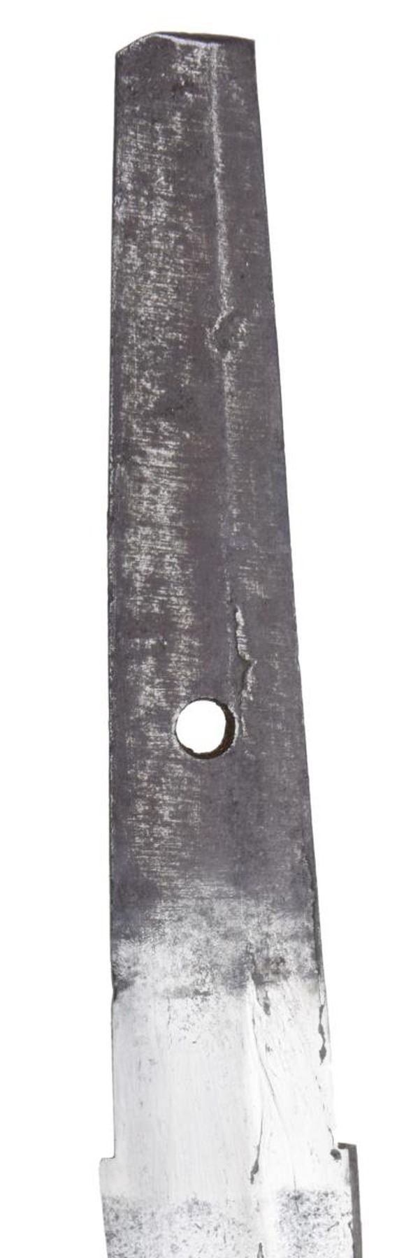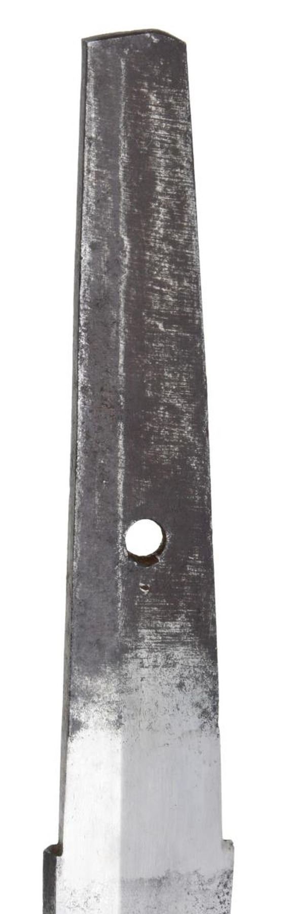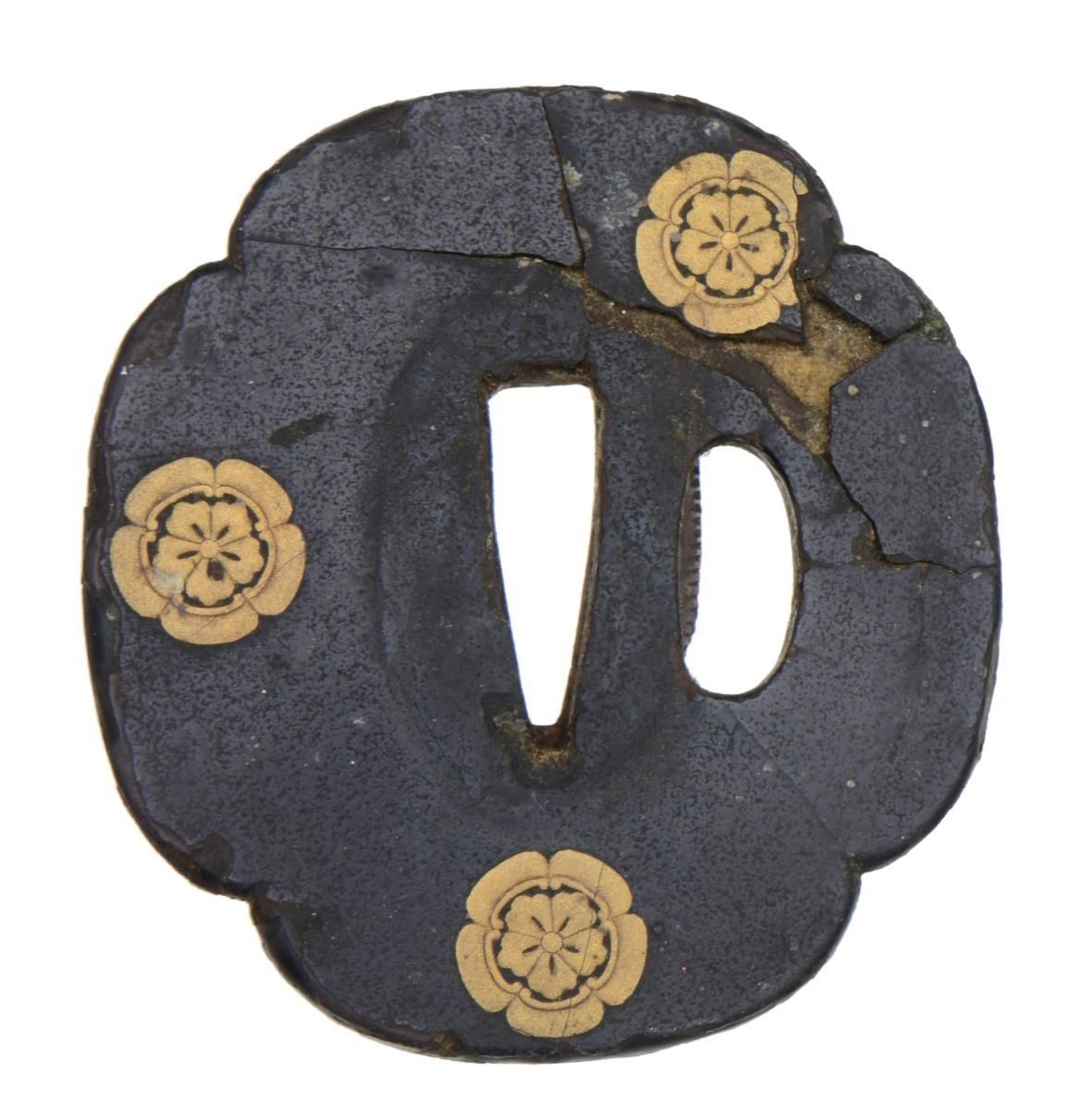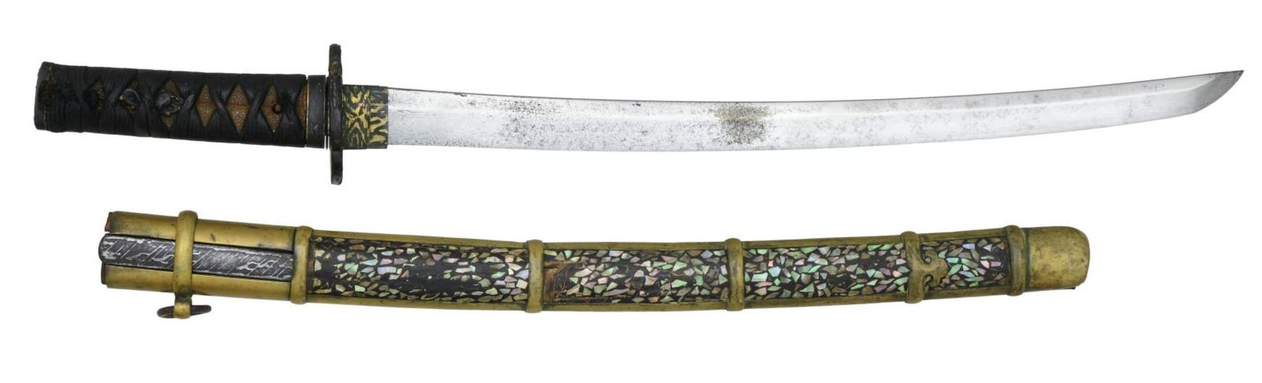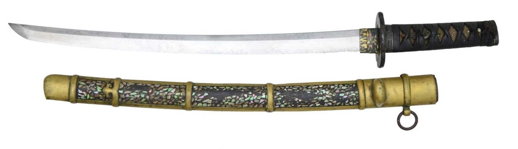Overall length: 25 1/2". Blade length: 18 1/2". Blade has a nearly imperceptible hamon that appears, in one section, to be straight. An interesting blackened and gilded copper two-piece habaki with a tiger pelt-like motif. Black lacquered wood tsuba with three inset brass cherry blossoms at the top. The tsuba appears to display the mon of the Oda clan, a well-known Samurai family. There is one seppa above and below the tsuba. The nakago has a single mekugi-ana with no signature present. The matching fuchi and kashira have a small amount of inlay work with a swimming and flying duck motif. The menuki appear to be blackened dragons with inlaid highlights. Black tsuka-ito over age-darkened white same. Saya is mother of pearl-inlaid black lacquer bound in brass. There is an iron kogatana on one side. CONDITION: blade is out of polish and shows areas of light pitting with a few smaller nicks to the ha. Tsuba is broken in one spot with losses, but the profile remains the same. Tsuka shows light to moderate wear, as does the saya. (02-21143/BF). $600-900.