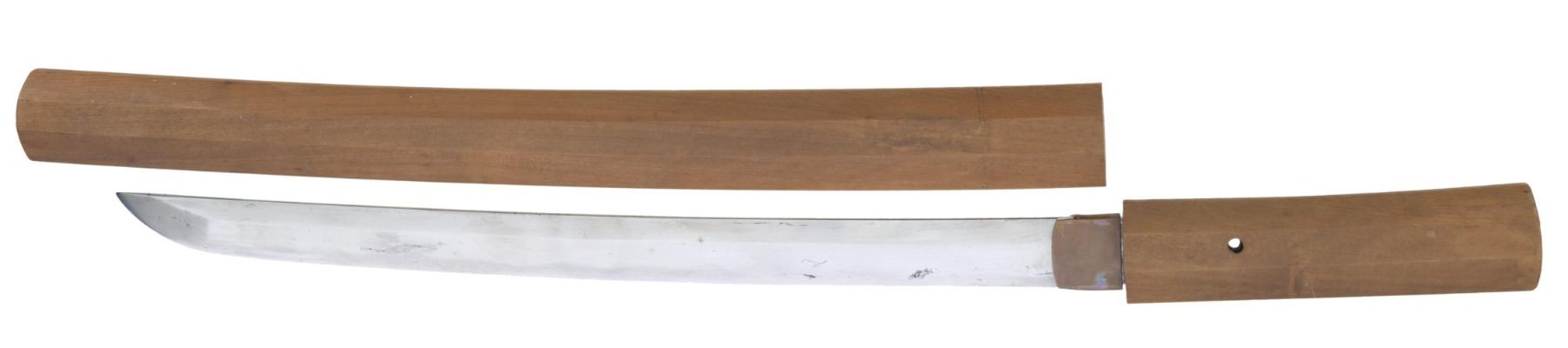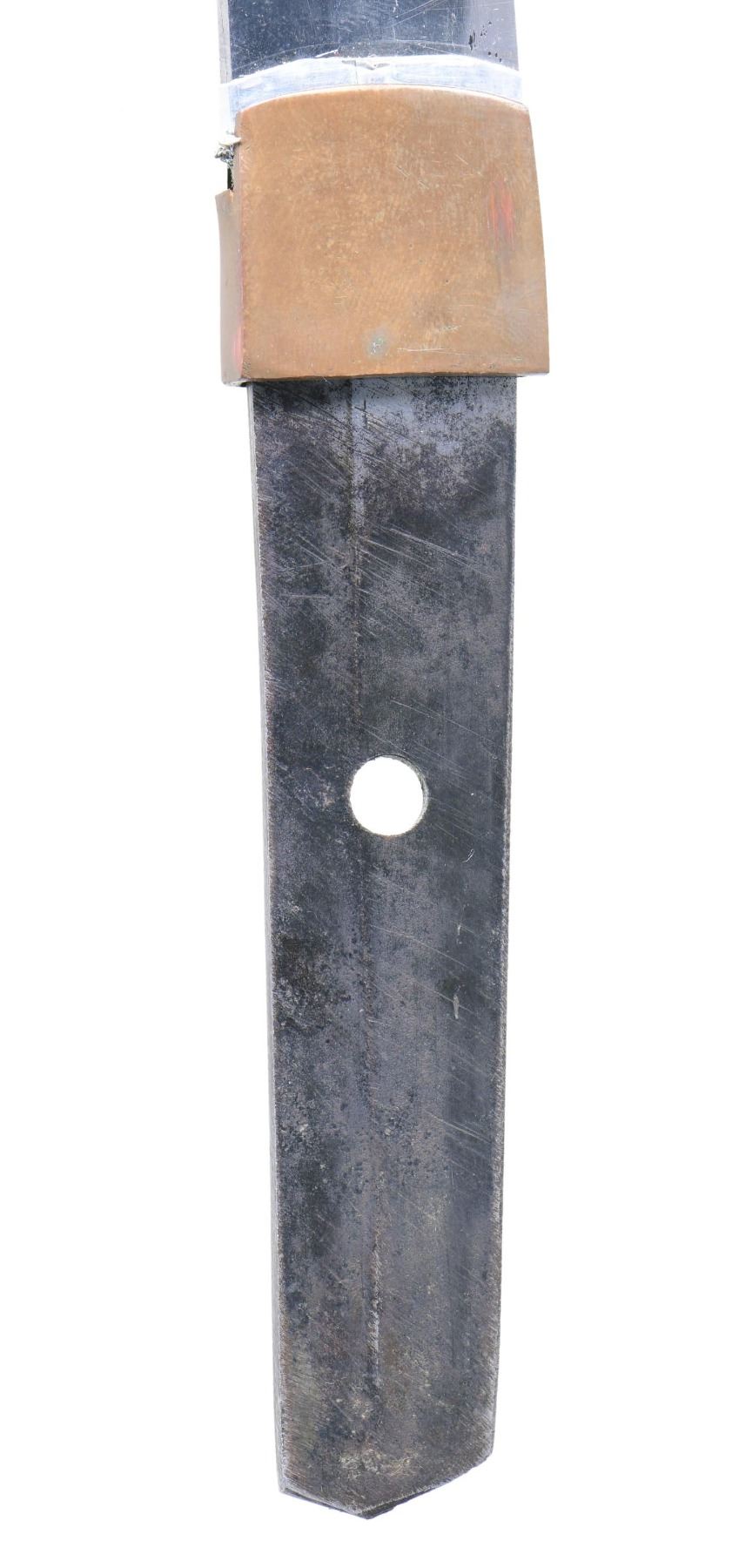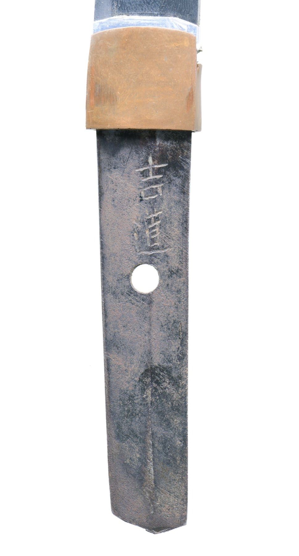 This wakizashi measures 20 7/8" overall while mounted in the shirasaya. The blade itself measures 14 1/2" with a slightly irregular hamon. Copper habaki with a nakago that has a single mekugi-ana and two-character signature. As stated, the blade is mounted in a shirasaya. UNATTACHED ACCESSORIES: there is a tag that comes with the sword that was originally attached with a plethora of Japanese characters and a serial number. There is also a small collector tag that reads "SIGNED YOSHINAO". CONDITION: blade has a very good polish but does show a few forging flaws that do not detract from the stability of the blade. The shirasaya shows storage wear only. (02-23629/BF). NON-GUN. $300-500.
