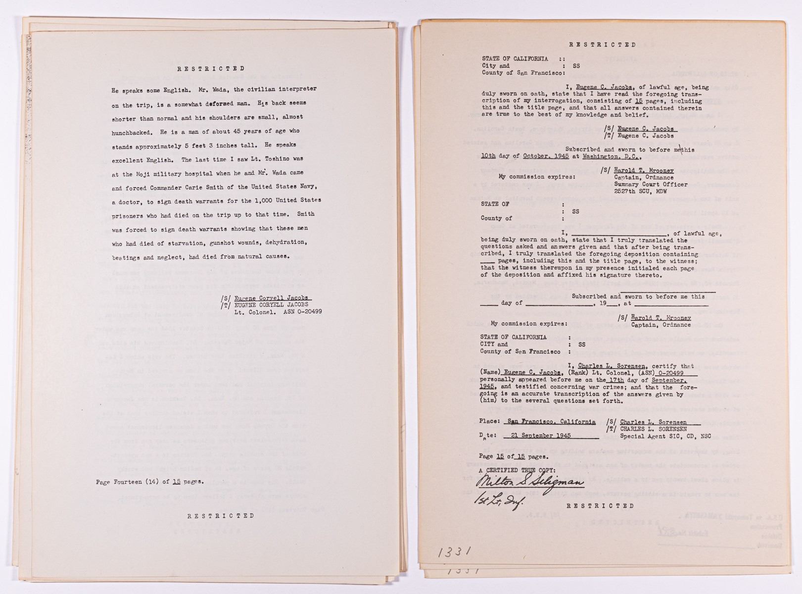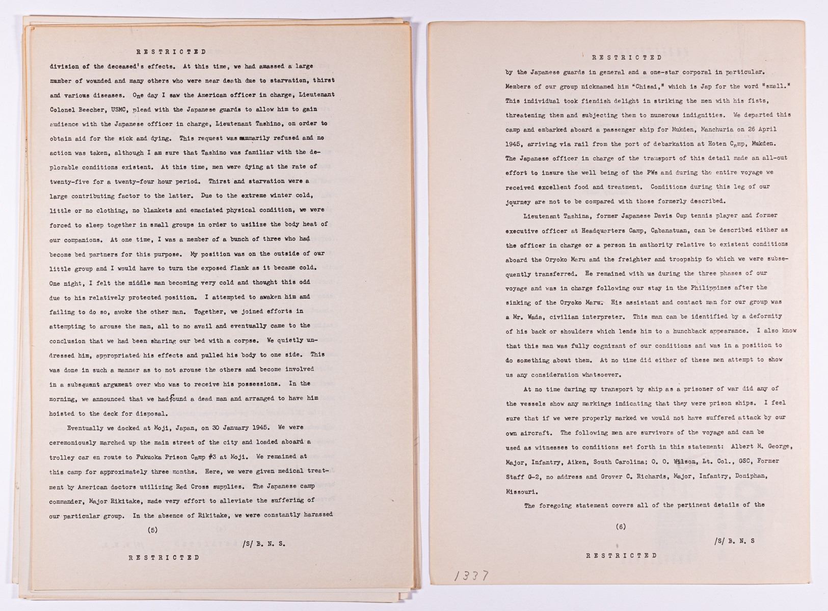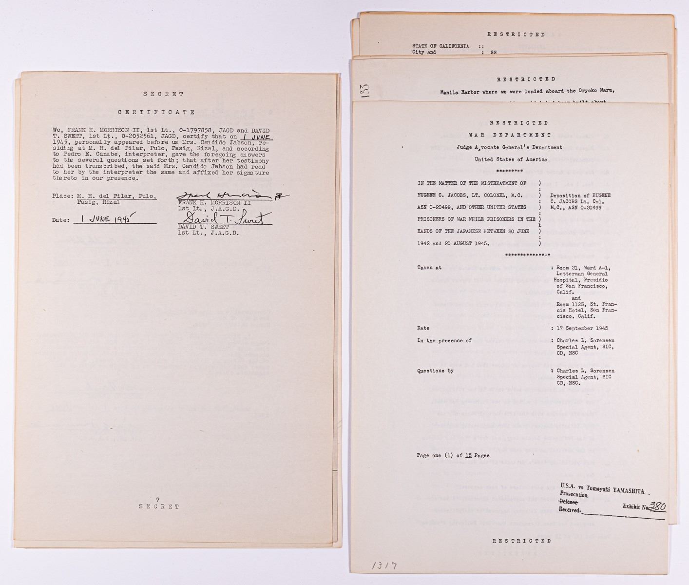 Period mimeographed copies of official secret and restricted documents of the trial of Tomoyuki Yamashita brought up on war crimes in 1945. In this document, several higher-ranking Japanese officers are named as having direct influence over the conditions of the camp. This testimony was given in the military trial 'America versus Tomoyuki Yamashita'. Testimonies are from civilians and soldiers who describe their mistreatment, abuse, and experiences at the hands of Japanese soldiers in the 32-page document. These prisoners of war recount how they were kept at several different places during their imprisonment such as Luzon, Echague, Cabanatuan, Bilibid Prison, Manila Harbor, Mukden, Hoten Camp, Japanese ship Oryoko Maru, San Fernando, Lingayen Bay, Takao Harbor, Moji Military Hospital, Fusan, Fukuoka, and Camp O'Donnell. The testimonies state that prisoners died from dysentery, malnutrition, suffocation, exposure, gunshot wounds, infection, or stab wounds and that about 27 men died a day under these conditions. One testimony explains the casualties of the prisoners of war due to the bombing of the Oryoko Maru and subsequent violence by the Japanese. One woman's testimony states that some Japanese soldiers wanted to rape her, but after being denied, soldiers killed her husband and attempted to kill her. Some testimonies explain that bargaining with the personal effects of the dead sometimes rewarded troops with water or small amounts of food. 13 x 9 inches. Minor pencil inscriptions on some pages. Very good.