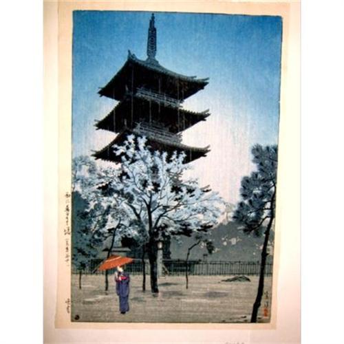 THIS IS A WOODBLOCK BY SHIRO. SCENE IS OF A RAINY DAY IN A GARDEN, WITH PAGODA IN BACKGROUND ALWAYS DONE WITH GREAT RICH COLORS AND ON RICE PAPER. SIGNED BY ARTIST WITH IMFORMATION WRITTEN IN OF THE STORY TELLING ABOUT THE SCENE, THIS IS AN EXTREMELY NICE PIECE.