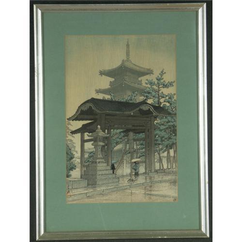 WOODBLOCK PRINT 9 1/2'' x 14'', Hasui Kawase (1883-1957). Rainy Scene at a Temple Gate. Mid-20th century.