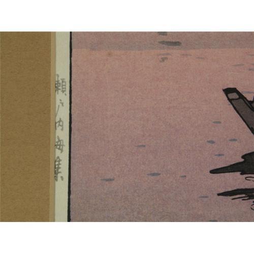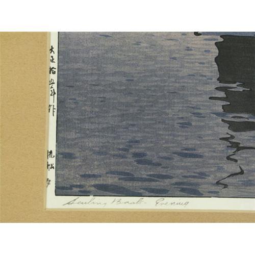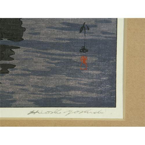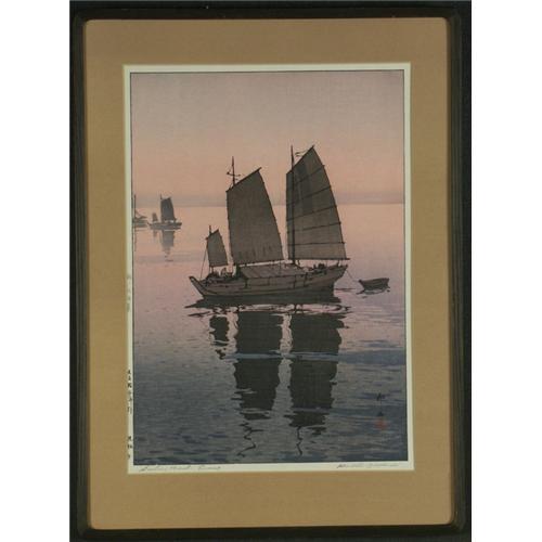 WOODBLOCK PRINT 14 1/4'' x 20'', Hiroshi Yoshida (1876-1950). From the ''Inland Seas'' series, A Sailboat at Dusk. Matted and placed in a wood frame. Tokyo gallery (Kanda's Gallery B-O-Q) label on the verso.