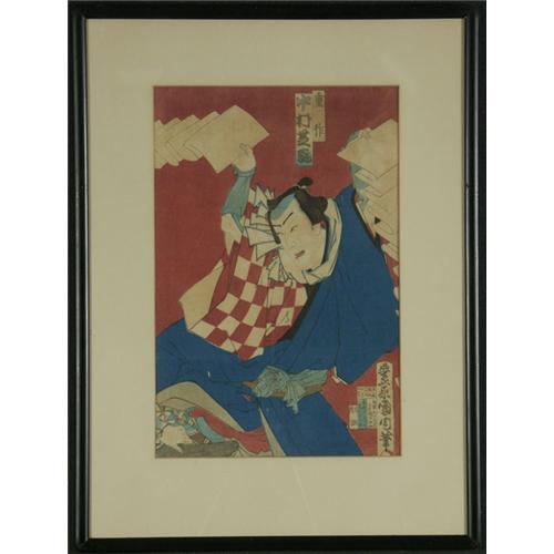 WOODBLOCK PRINT 13 1/2'' x 9'', Kunichika Toyohara (1835-1900). ''Actor'' print, central image of a triptych. A Man with Cascading Paper in Hand. Mid-19th c. Note folds, stains, imperfections.