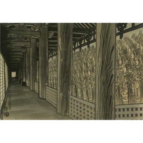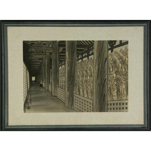 JAPANESE WOODBLOCK PRINT (10.5'' x 15.25''). Buddhist Ancestor Figures. Signed lower left. Matted with rice paper matting and placed in a simple wood frame. 15.5'' x 21'' framed.