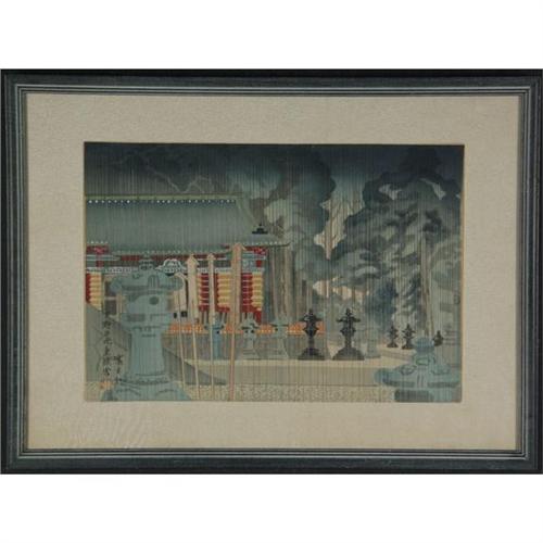 JAPANESE WOODBLOCK PRINT 10.25'' x 15''. Garden Lanterns in the Rain. Signed lower left. Matted with rice paper matting and placed in a simple blue wood frame. 15.5'' x 21.25'' framed.