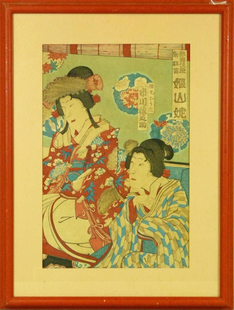 Japanese woodblock depicting maidens. Measures 14" height x 9 1/4" width + 2 3/4" mat & frame (35.5cm x 23.4cm + 6.9cm). Provenance: Sam Feldman Collection.
