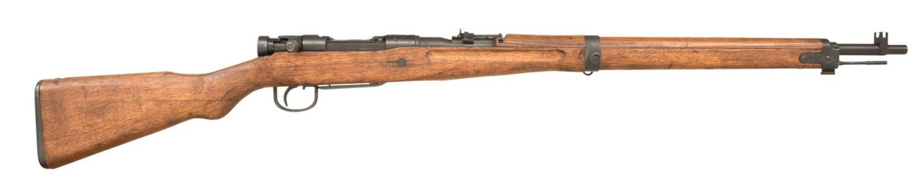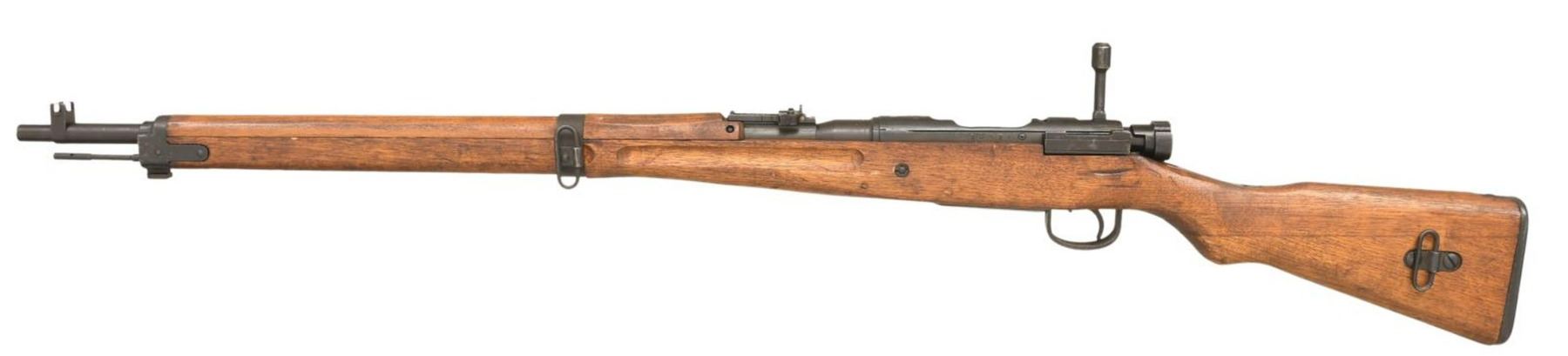 RIFLE. Cal. 7.7 Jap. S# 10878. S# matches on receiver, bolt, extractor and bayonet lug. Bbl. 25 1/2". Fine example of a Type 99 rifle with transitional features. "Mum" has been ground and given chisel marks but is visible. Type 99 characters are legible. Receiver rail is marked on left side with Nagoya Arsenal marking. Ladder aperture rear sight made without AA wings. Graduated to 1500 yards. Inverted V front sight with protective ears. Bolt has cylindrical knob. Grooved safety knob. Cleaning rod is present but not readily removed. Two screw upper band has welded construction. Solid lower band without provision for mono pod. Hardwood stock set with full length hand guard. Small recoil bolt. Buttstock has 2 piece construction. Acceptance mark is visible behind lower tang. Two screw butt swivel. Cup type buttplate. CONDITION: stock set retains most of its original finish but has scattered handling marks indicating a degree of careful use. Two notable indentations above trigger guard on left side. Metal retains 90% original blue finish with thinning and light wear. Finish around "Mum" shows grind marks. Very good shiny bore. (23-5535/RW). CURIO. $200-300.