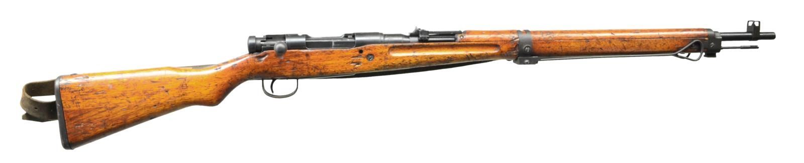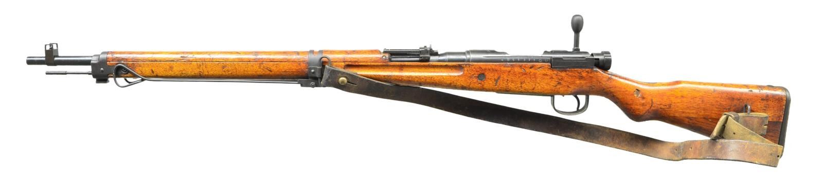 Cal. 7.7 Jap. S# 51371. Bbl. 25 1/2". Numbers match on receiver, bolt & bayonet lug. Rifle marked on top of receiver ring w/ intact mum & 99 Type characters. Left receiver rail marked w/ "Toyo Kogyo (Hiroshima Prefecture)" arsenal marking. Ladder aperture rear sight graduated to 1,500 meters w/ AA wings. Inverted V front sight w/ protective ears. Oval bolt knob. Notched checkered safety knob. Cleaning rod & bayonet lug are present. 3 Screw upper band. Original monopod is present. Correct Japanese leather sling. Hardwood stock set w/ long handguard. Buttstock has sm. recoil bolt. 2 Screw rear swivel. Cup type steel buttplate. CONDITION: stock set has original finish w/ extensive wear, dents, staining & scratches throughout commensurate w/ hard service. Sm. crack behind trigger guard tang. Metal retains 50% blue turning gray & patina w/ light oxidation scattered throughout. Very good shiny bore. (22-670/RW). CURIO. $300-500.