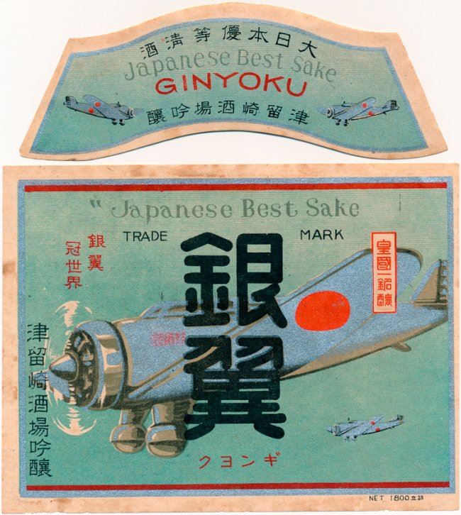 Unused World War II sake bottle label, 6" x 4 1/2", pictures two Japanese "Zero" fighters in flight with the motto at top in english: "Japanese Best Sake". With a second label, very similar, which would be applied to the neck of the bottle (bears mounting remnant on verso). Very good.