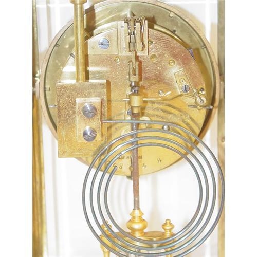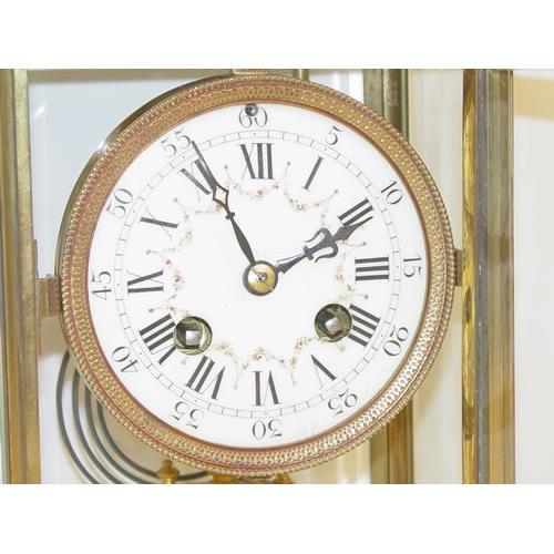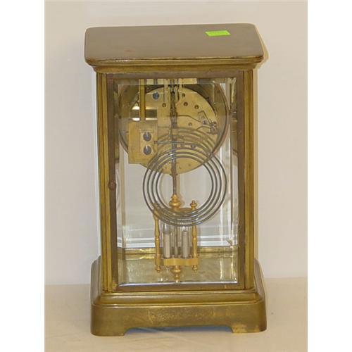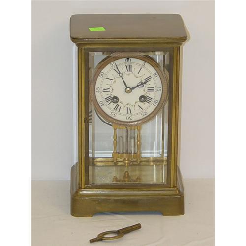 JAPY FRERES FRENCH CRYSTAL REGULATOR MANTLE CLOCK W/ BRASS & BEVELED GLASS CASE, ENAMEL FACE & FANCY PENDULUM & KEY (10" T X 6 1/4" W X 5" D) - WEAR, OXIDATION, IMPERFECTIONS