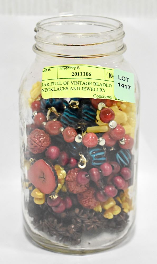 JAR FULL OF VINTAGE BEADED NECKLACES AND JEWELLRY