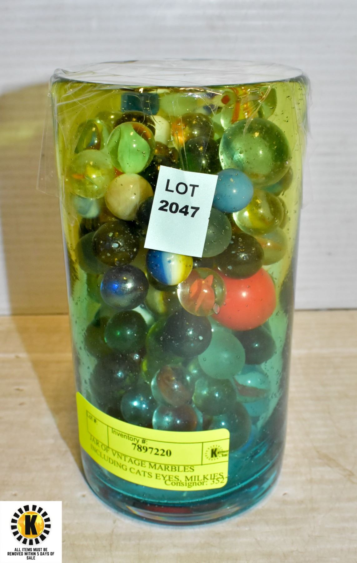 JAR OF VNTAGE MARBLES INCLUDING CATS EYES, MILKIES