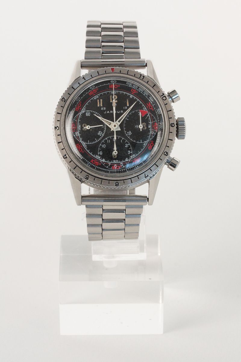 JARDUR chronograph, around 1950. Round steel case, diam. 37 mm, n. 1211, with rotating bezel marked from 1 to 12 for the second time zone (good condition). Black dial with painted Arabic numerals, tachymeter scale and red sexagesimal degrees for air navigation (good condition, original). Round movement with manual winding cal. Valjoux 72 (good condition). Dial signed.