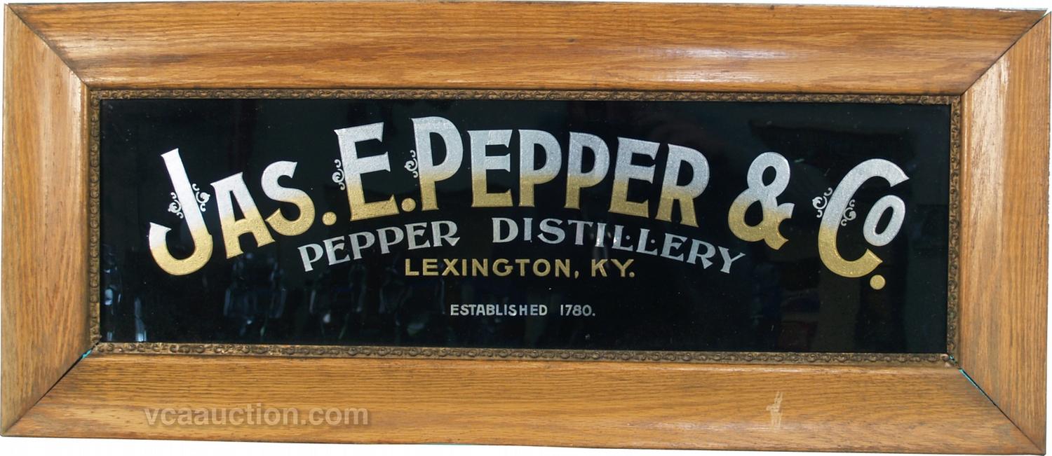 JAS. E. Pepper & Co. Pepper Distillery Reverse On Glass Sign Lexington, KY., all original in wood frame - 34" x 14"