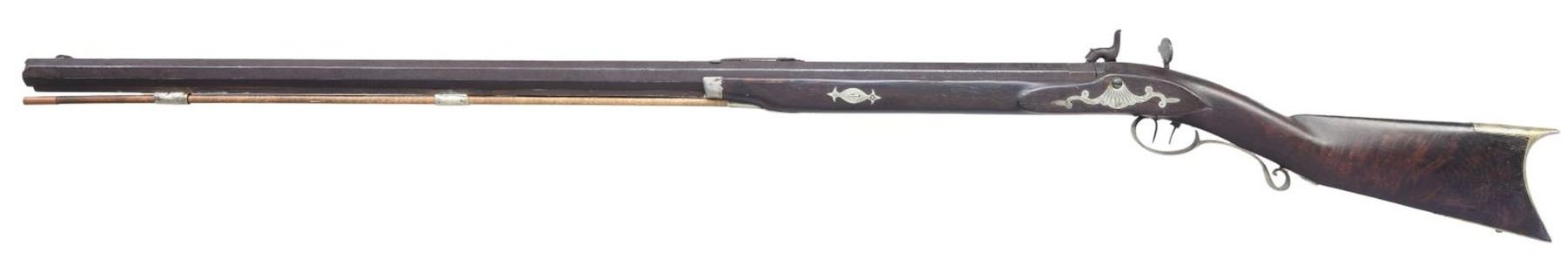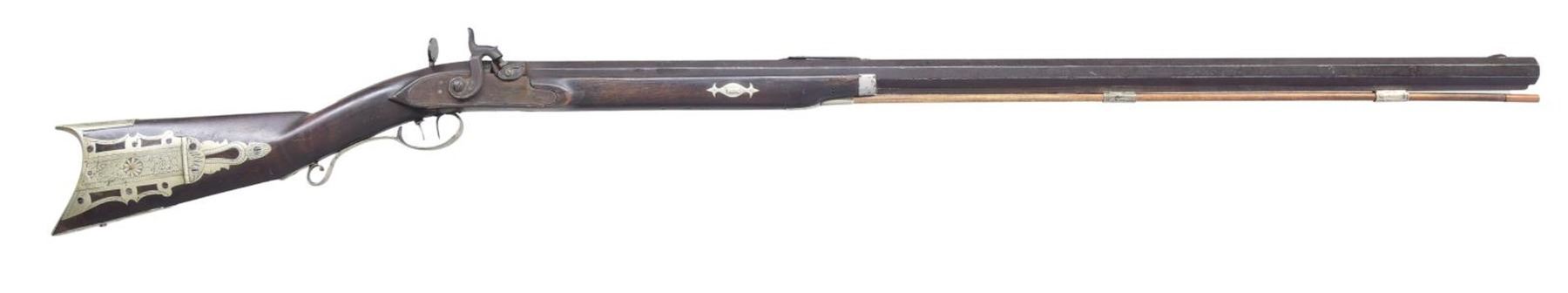 Cal. 40. NSN. Bbl. 35 3/4". Halfstock percussion Kentucky rifle produced by Jas Golcher. Lockplate is engraved with light scroll engraving and a scene of a hunter and hunting dog at the rear, with "JAS GOLCHEr"/ WARRANTED/ FORGED" at the center. Dolphin form hammer with light foliate scroll engraving. Top flat of of the octagonal bbl. is faintly engraved "Craig". Wood halfstock features a German silver buttplate, patchbox, sideplate, trigger guard, bbl. wedge escutcheons, nosecap, and ramrod ferrules. Buttplate and sideplate exhibit decorative engraving, with attractive foliate scrollwork and motifs present on the patchbox and trigger guard. German silver blade front sight and adj. aperture rear sight, with double set triggers. CONDITION: bbl. retains a dark gray and moderate pitting overall, with the sideplate retaining a mottled gray patina. German silver components exhibit varying degrees of patina, with most remaining very good overall. Ramrod ferrules have been soldered into place. Buttstock exhibits scattered marks from handling and storage, with scattered chipping and hairline cracks, as well as a replaced section of wood at and around underside / right side of the lockplate, and on the left side of the forearm stemming from the nosecap. (01-25107/MLW). ANTIQUE. $2,000-3,000.