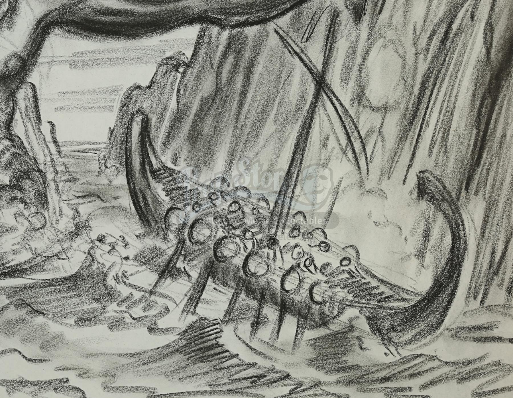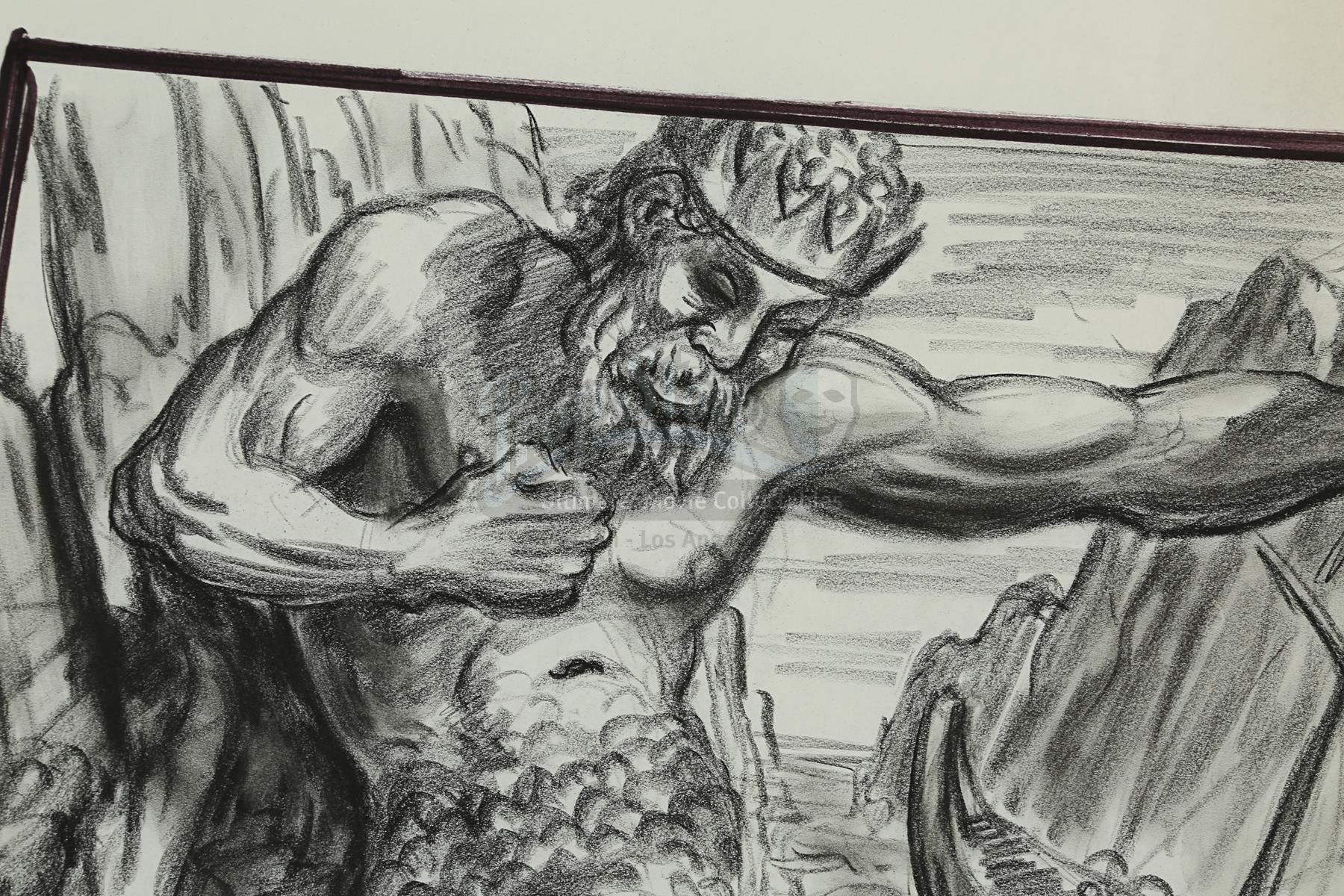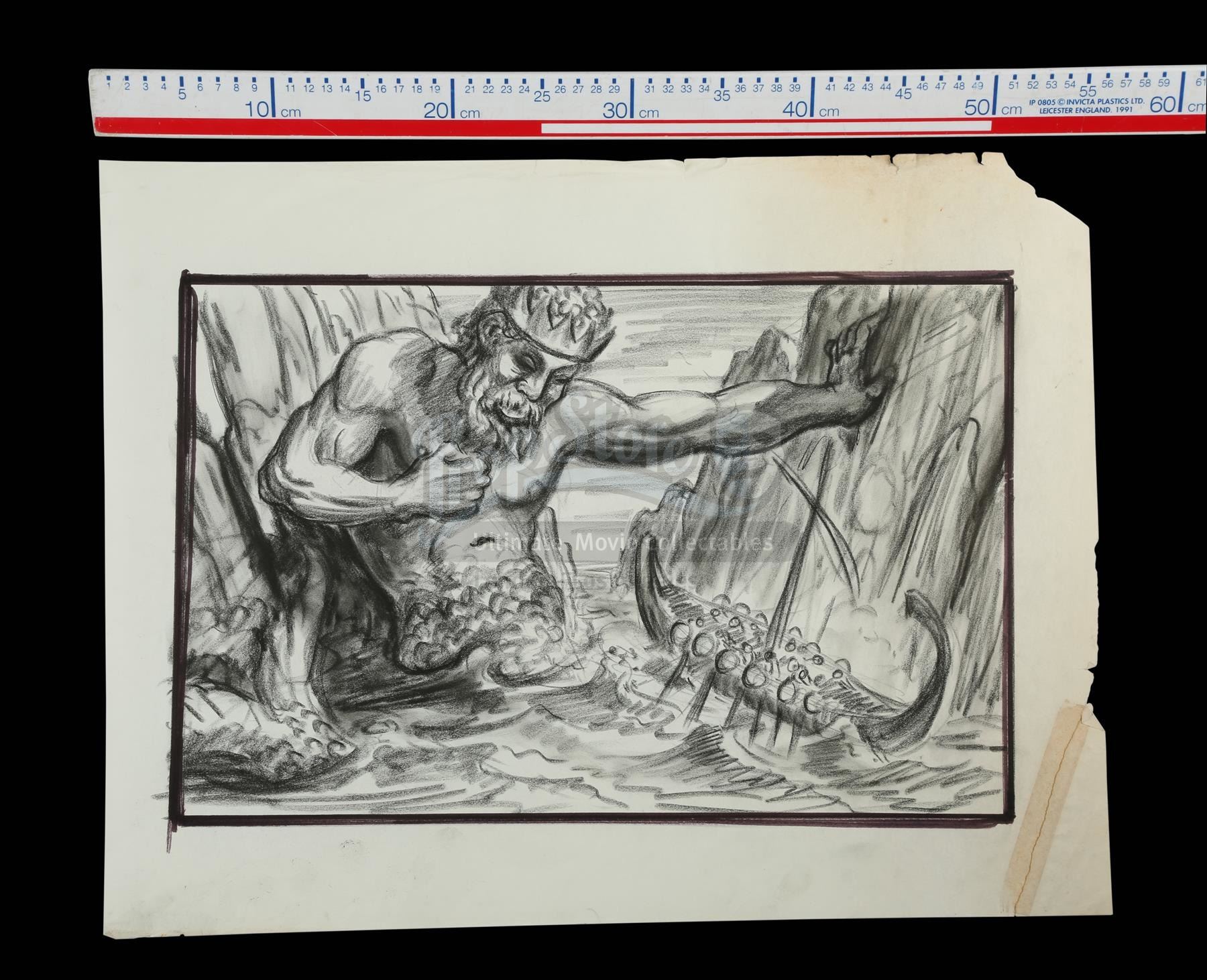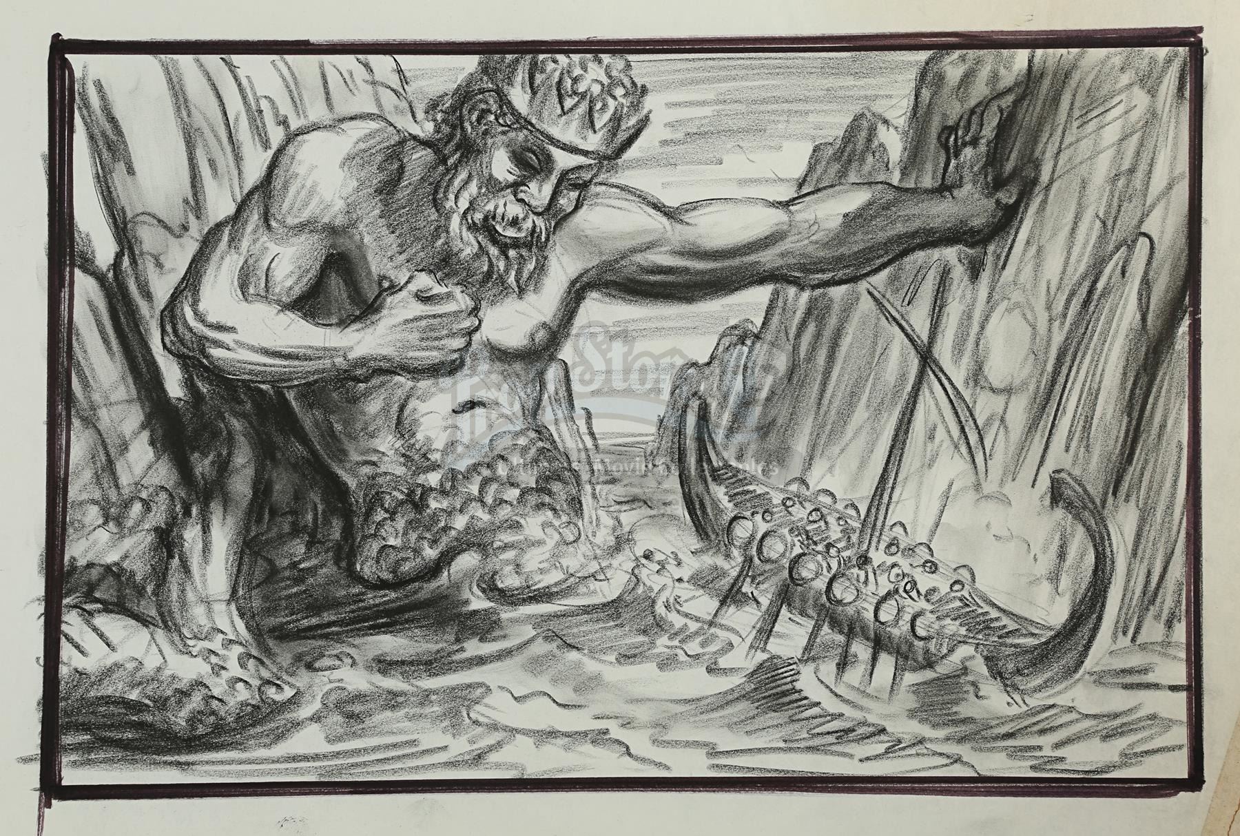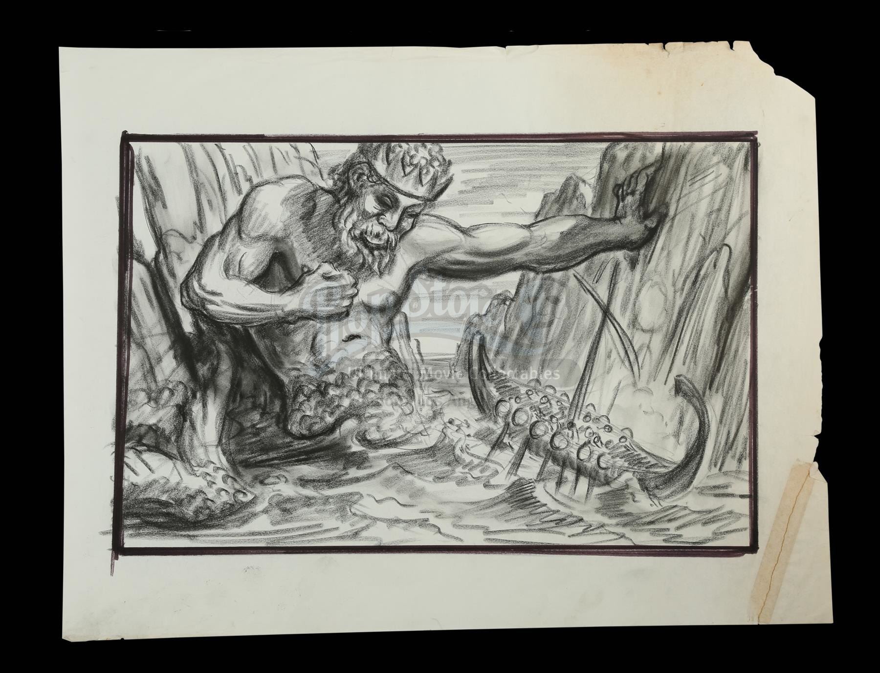 A hand-drawn concept sketch from circa 1961 displaying Triton (William Gudgeon) and the Argo from the Don Chaffey fantasy-adventure film Jason and the Argonauts. The image shows Triton, son of Poseidon, holding back the rocks to allow the Argo safe passage.