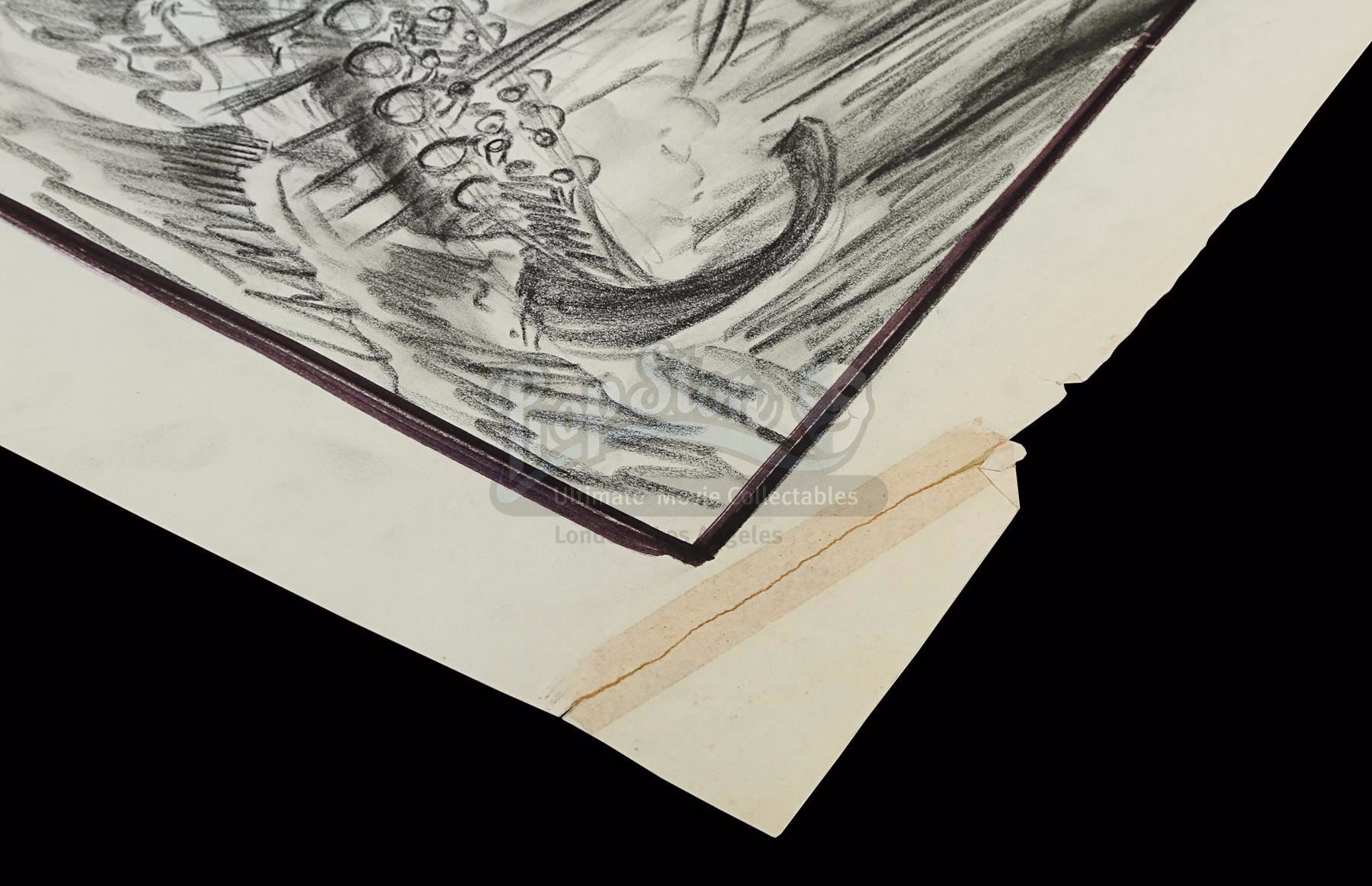 It is executed in charcoal on paper. A black ink border completes the composition. The lower-right corner is torn with a tape repair, and a section of the upper-right corner is missing. Otherwise the artwork is in very good condition. Dimensions: 43 cm x 56 cm (17'' x 22'')
