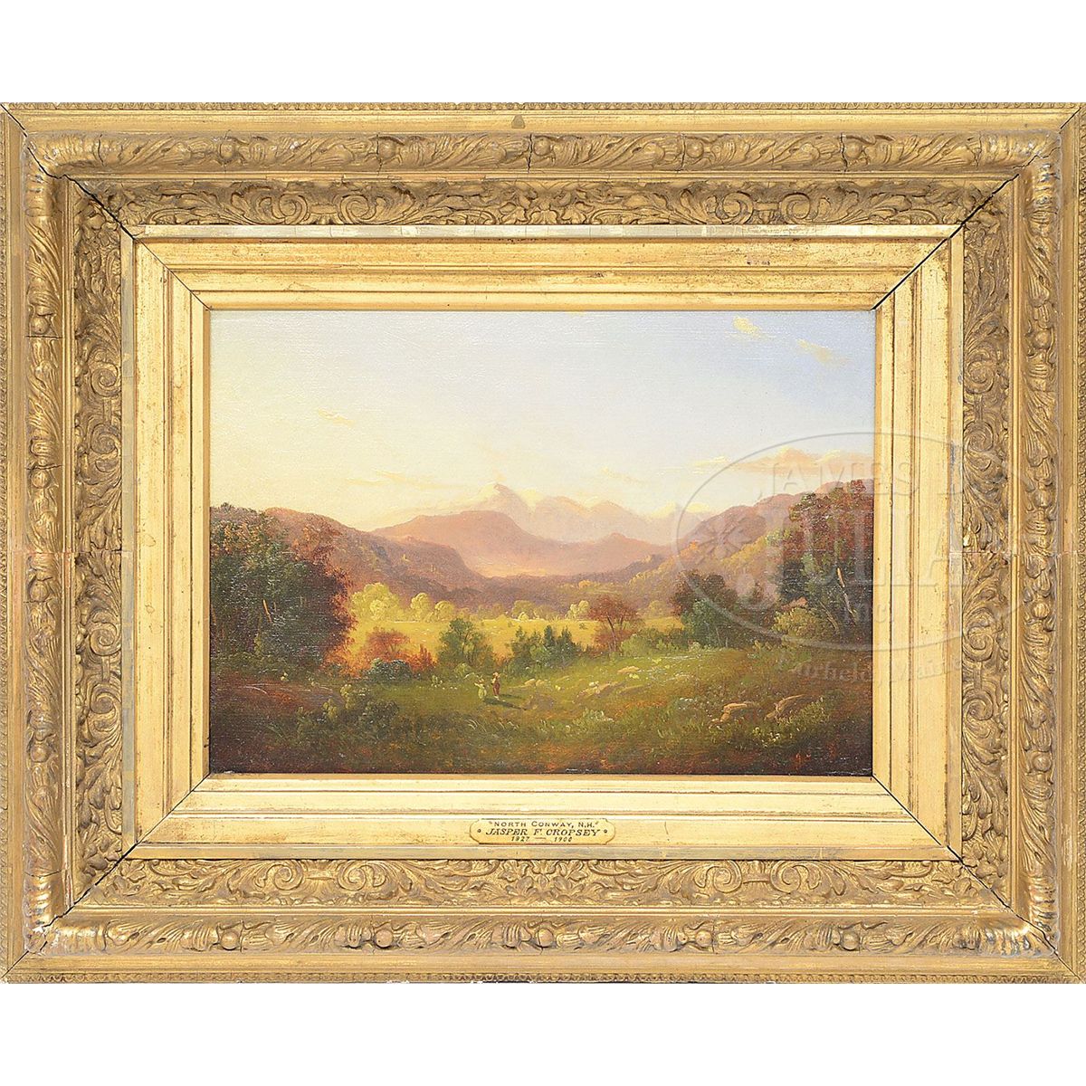 Oil on wood panel Housed in a period gesso decorated cut down gilt frame with gilt liner, having artist and title plaque Signed very lightly "J.F. Cropsey" and dated illegibly, bottom right Inscription on verso in pencil "North Conway N.H. Cropsey 1877" SIZE: 10" x 14". Overall: 18-1/2" x 22-1/2" CONDITION: Scattered inpainting, very good 7-70329