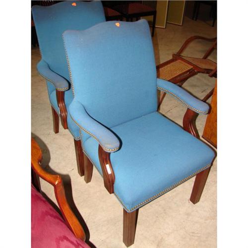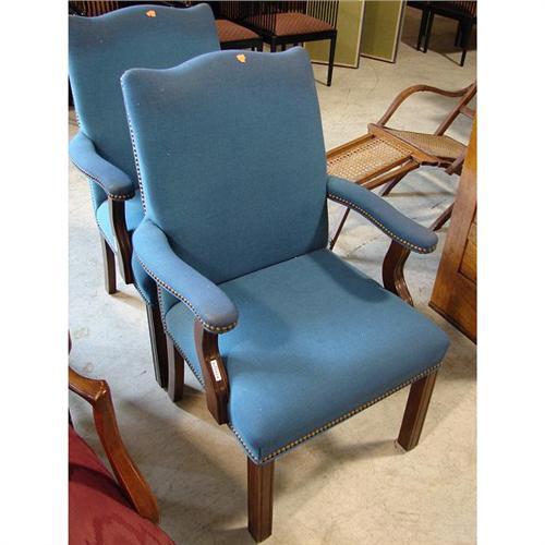 PAIR OF JASPER OPEN ARM SIDE CHAIRS. With brass tack blue upholstery and walnut arm supports and legs. 39” H to top of backs.