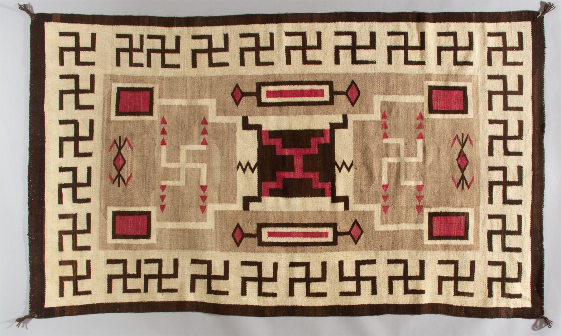 This JB Moore Storm Pattern Navajo Rug, Ca. 1920-1930, is a variant of the 1911 Moore Catalogue, Plate XXVIII (28) weaving with a whirling log border all around. Hand woven from all native handspun and hand dyed Churro cross sheep wool on a wool warp. Includes pictorial water bugs on each end. At the time of weaving, whirling logs crossing each other was a sacred symbol used in Southwest Native Amercian weavings, baskets, pottery, and jewelry connotating the four directions (north, south, east, & west) and the winds from them. The whirling log symbol is seen as a symbol of good luck or well-being, friendship, and the four stages of life: birth, youth, old age, and death. Since 1940, the Navajo, Hopi, Papago, & Apache people stopped incorporating the whirling log symbols in their crafts due to their beloved symbol looking so much like the Nazi swastika. The Navajo signed a proclamation stating "Because the above ornament, which has been a symbol of friendship among our forefathers for many centuries, has been desecrated by another nation of peoples, therefore it is resolved that henceforth from this date on and forever more our tribes renounce the use of the emblem commonly known today as the swastika or fylfot on our blankets, baskets, art objects, sand paintings and clothing."