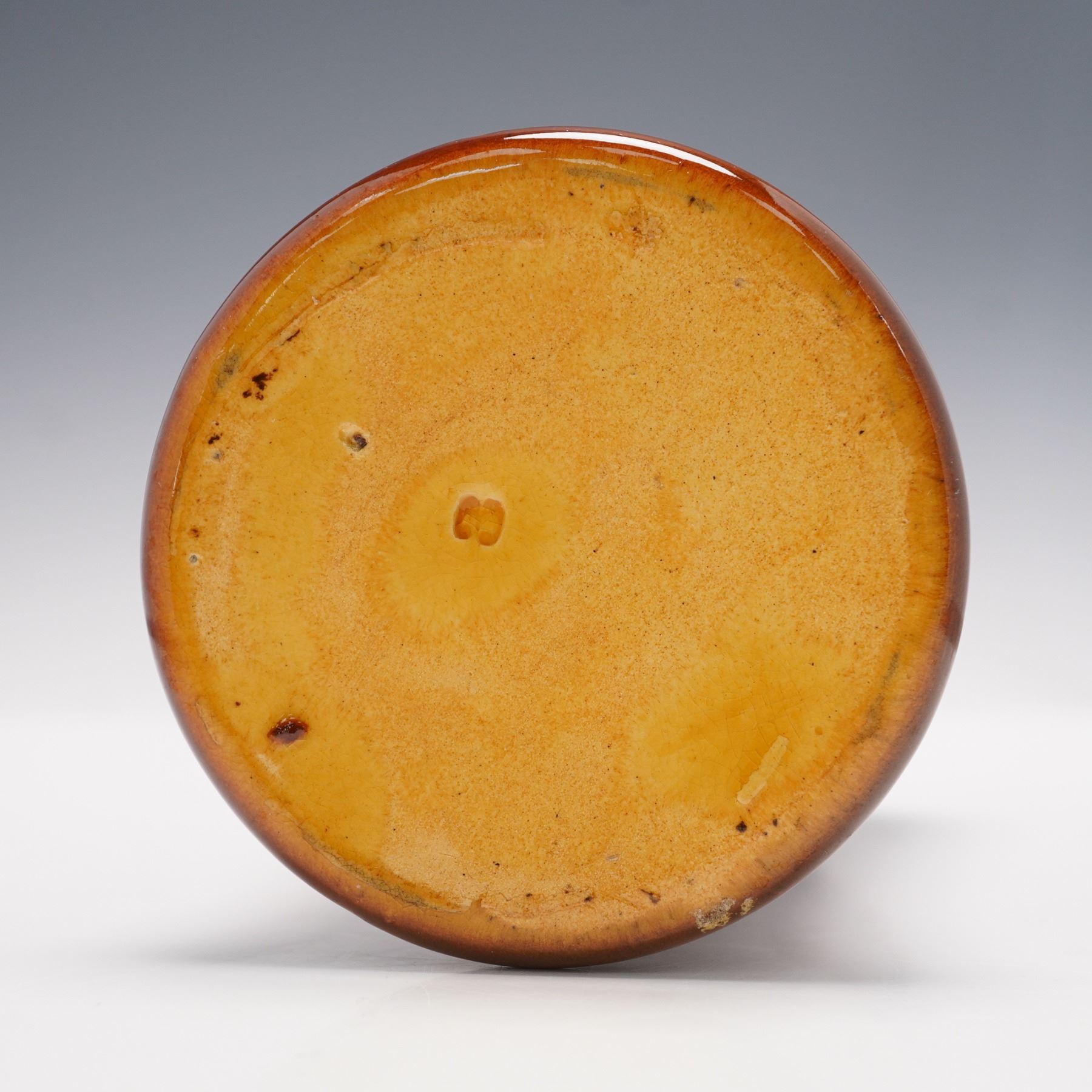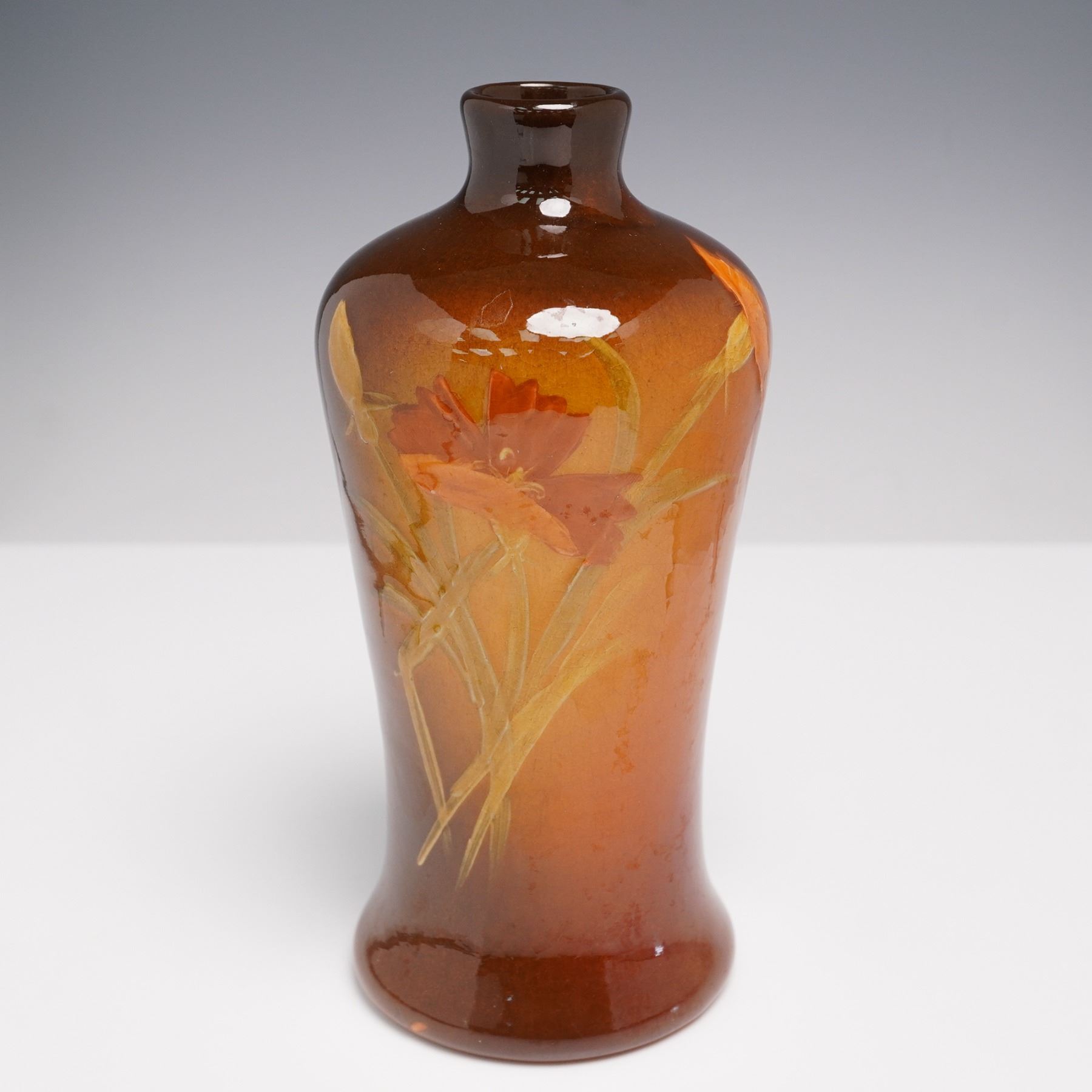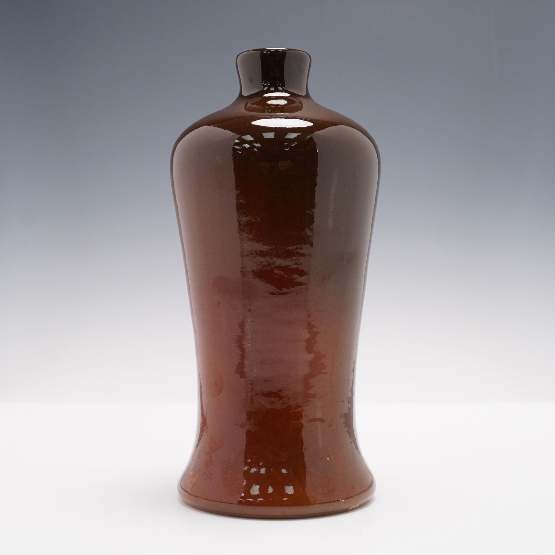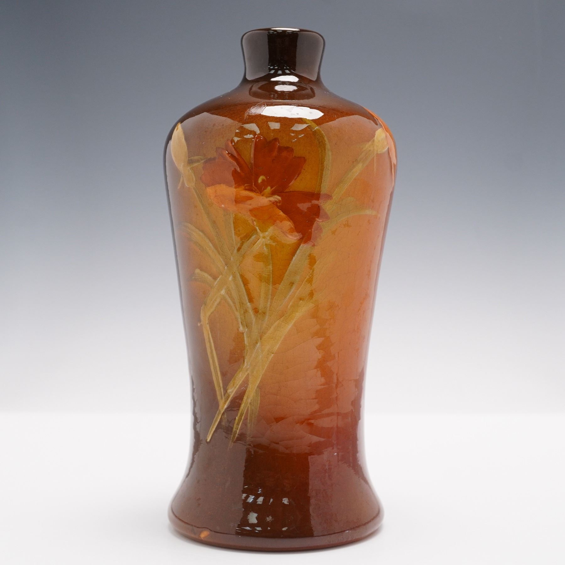 This tall vase in rich brown glaze features soft orange and golden tones with a delicate floral design rising along its surface. The gently curved form and glossy finish highlight the artistry and warmth of the piece. Artist initials.