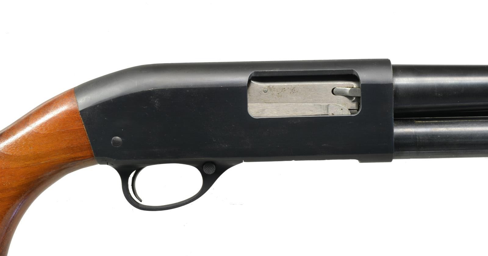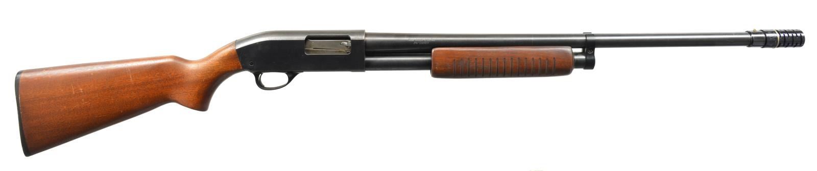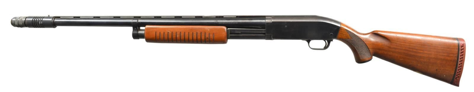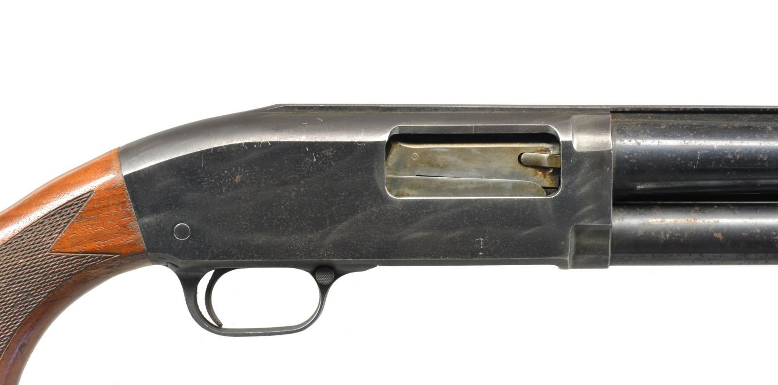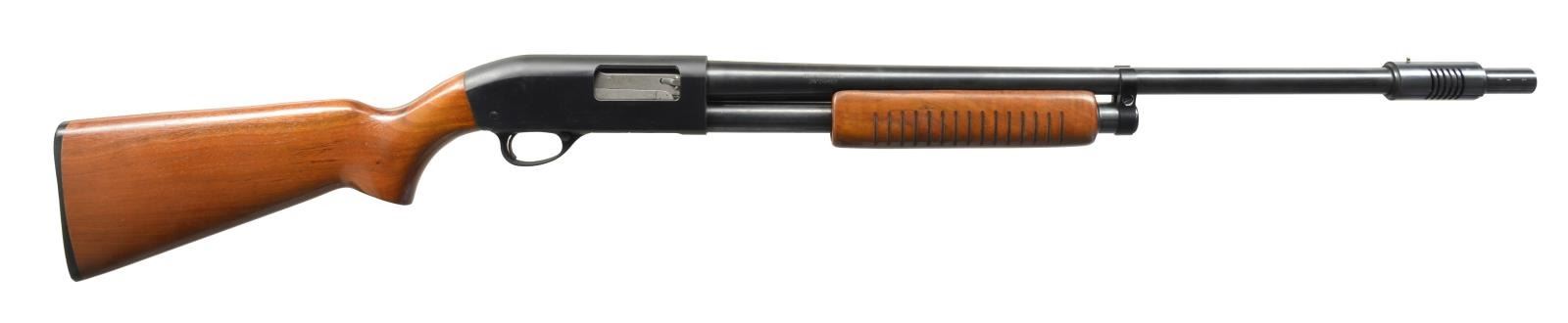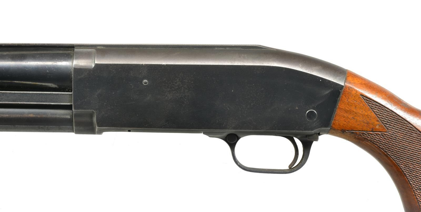 ALL: cal. 12 Ga., 2 3/4". NSN. All mfg. by High Standard. 1) JC HIGGINS MODEL 20. Bbl. 26 1/2" VR w/ ported adj. choke & brass bead. Blued steel action. Grooved walnut forearm & plastic capped pistol grip stock w/ checkered wrist, presentation plate on toeline & original recoil pad. CONDITION: 70% lightly worn blue showing areas of surface rust. Rib is bent between first & 2nd posts. Wood shows moderate wear w/ scratches, dents & handling marks. Very good bright bore. (20-2539/DS). 2) JC HIGGINS MODEL 20. Bbl. 26" plain over Cyclone Duo-vent adj. choke & brass bead. Blue finished steel action. Grooved walnut forearm & pistol grip stock w/ original buttplate. 80% Lightly faded blue w/ light pitting on top of receiver. Original wood finish shows scattered scratches & marks. Very good bright bore. (20-2540/DS). 3) SEARS/TED WILLIAMS MODEL 21. Bbl. 27" VR over adj. choke. Brass front & mid beads. Blued steel action w/ alloy trigger guard. Walnut forearm & plastic capped pistol grip stock w/ cut checkering. Name plate in toeline & original recoil pad. CONDITION: 80% blue showing scattered surface corrosion. Forearm is loose on iron. Stock has heavy coat of added finish over scratches, dents & marks. Very good bright bore. (20-2552/DS). 4) JC HIGGINS MODEL 20. Bbl. 26 1/2" plain over ventilated adj. choke w/ interchangeable tubes; Mod. tube included. Brass bead. Blued steel action w/ alloy trigger guard. Grooved walnut forearm & pistol grip stock w/ original buttplate. CONDITION: over 95% original blue. Stocks have very good finish. Very good bright bore. (20-2553/DS). 5) JC HIGGINS MODEL 20. Bbl. 27" VR over adj. choke. Brass front bead. Blued steel action w/ alloy trigger guard. Forearm & plastic caped pistol grip stock have cut checkering, nameplate in toeline & original buttpad. CONDITION: 60% dull faded blue showing areas of pitting. Wood has added finish over scratches & handling marks. Bore shows areas of very light pitting. (20-2563/DS). ALL CURIO. $750-1,250.