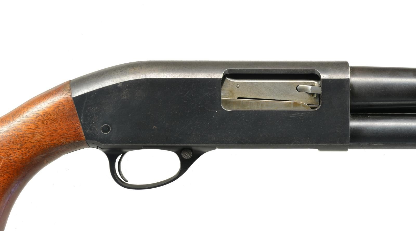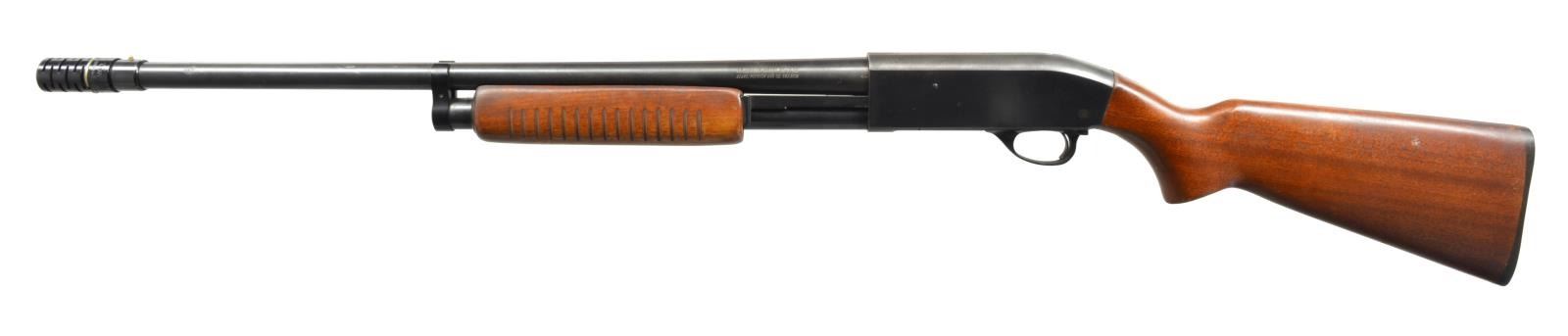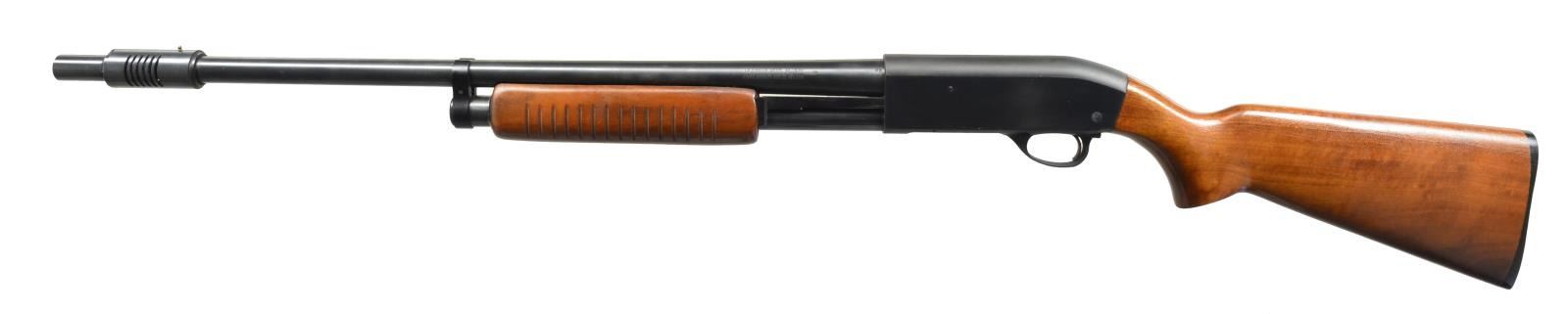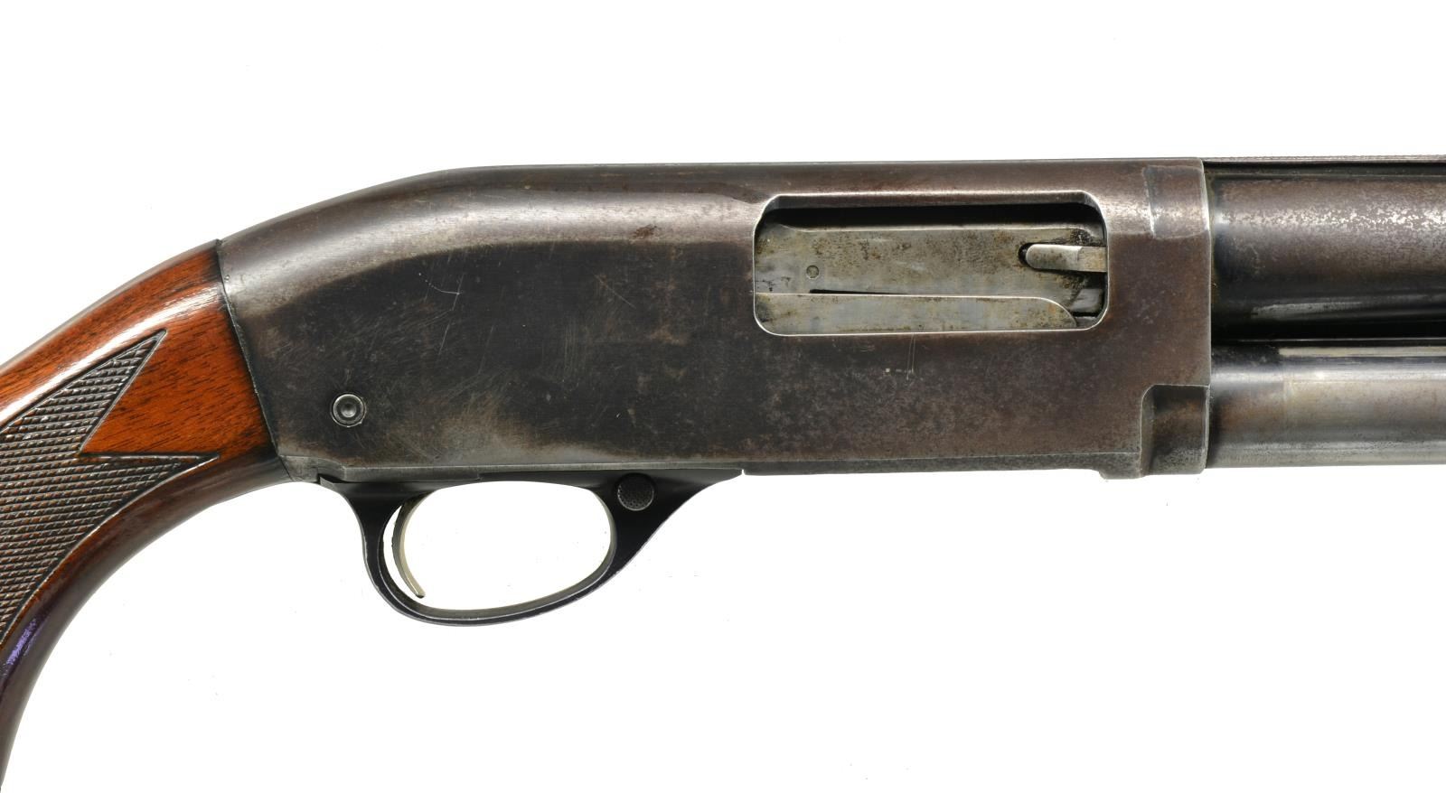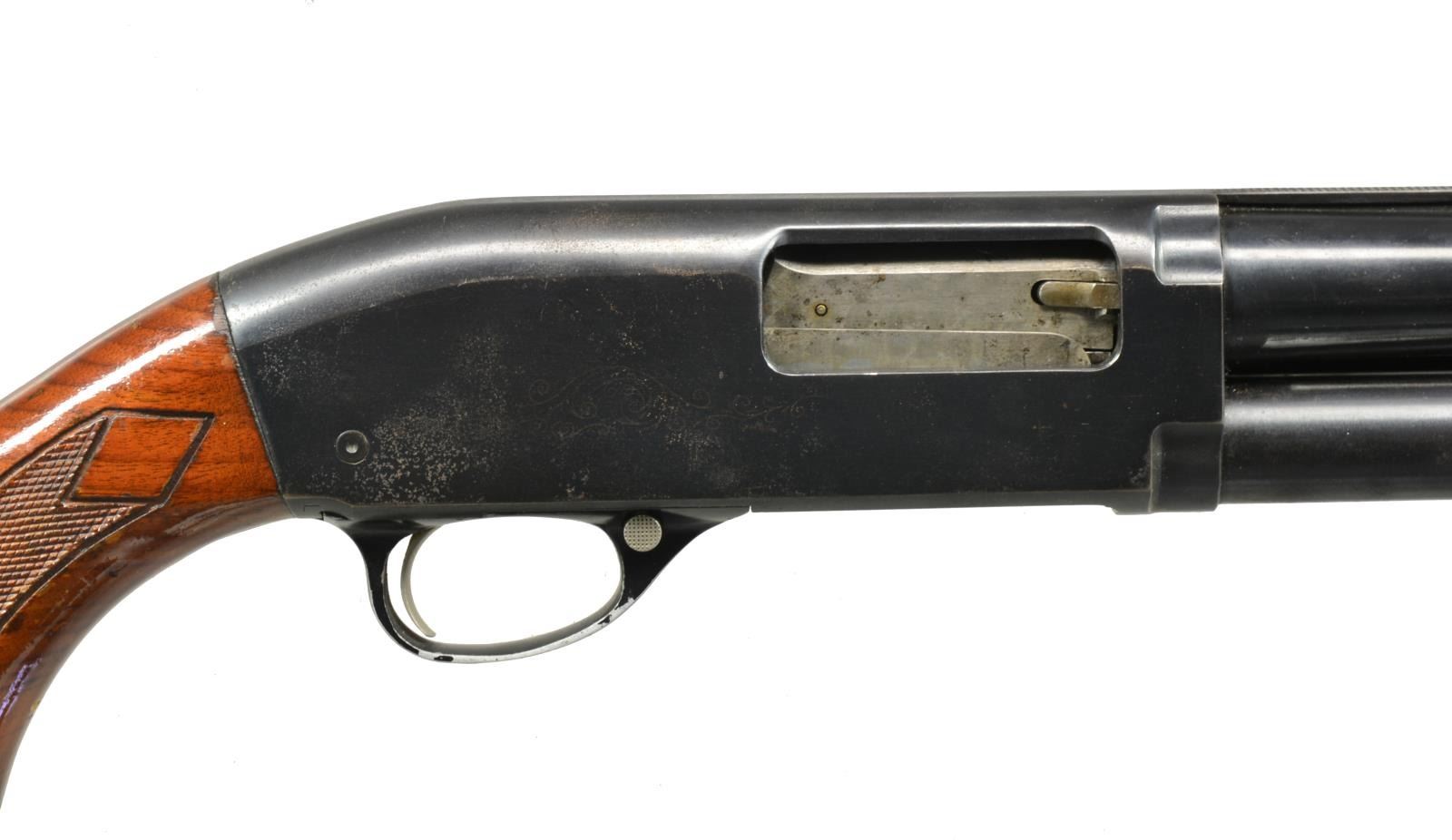 ALL: cal. 12 Ga., 2 3/4". NSN. All mfg. by High Standard. 1) JC HIGGINS MODEL 20. Bbl. 26 1/2" VR w/ ported adj. choke & brass bead. Blued steel action. Grooved walnut forearm & plastic capped pistol grip stock w/ checkered wrist, presentation plate on toeline & original recoil pad. CONDITION: 70% lightly worn blue showing areas of surface rust. Rib is bent between first & 2nd posts. Wood shows moderate wear w/ scratches, dents & handling marks. Very good bright bore. (20-2539/DS). 2) JC HIGGINS MODEL 20. Bbl. 26" plain over Cyclone Duo-vent adj. choke & brass bead. Blue finished steel action. Grooved walnut forearm & pistol grip stock w/ original buttplate. 80% Lightly faded blue w/ light pitting on top of receiver. Original wood finish shows scattered scratches & marks. Very good bright bore. (20-2540/DS). 3) SEARS/TED WILLIAMS MODEL 21. Bbl. 27" VR over adj. choke. Brass front & mid beads. Blued steel action w/ alloy trigger guard. Walnut forearm & plastic capped pistol grip stock w/ cut checkering. Name plate in toeline & original recoil pad. CONDITION: 80% blue showing scattered surface corrosion. Forearm is loose on iron. Stock has heavy coat of added finish over scratches, dents & marks. Very good bright bore. (20-2552/DS). 4) JC HIGGINS MODEL 20. Bbl. 26 1/2" plain over ventilated adj. choke w/ interchangeable tubes; Mod. tube included. Brass bead. Blued steel action w/ alloy trigger guard. Grooved walnut forearm & pistol grip stock w/ original buttplate. CONDITION: over 95% original blue. Stocks have very good finish. Very good bright bore. (20-2553/DS). 5) JC HIGGINS MODEL 20. Bbl. 27" VR over adj. choke. Brass front bead. Blued steel action w/ alloy trigger guard. Forearm & plastic caped pistol grip stock have cut checkering, nameplate in toeline & original buttpad. CONDITION: 60% dull faded blue showing areas of pitting. Wood has added finish over scratches & handling marks. Bore shows areas of very light pitting. (20-2563/DS). ALL CURIO. $750-1,250.