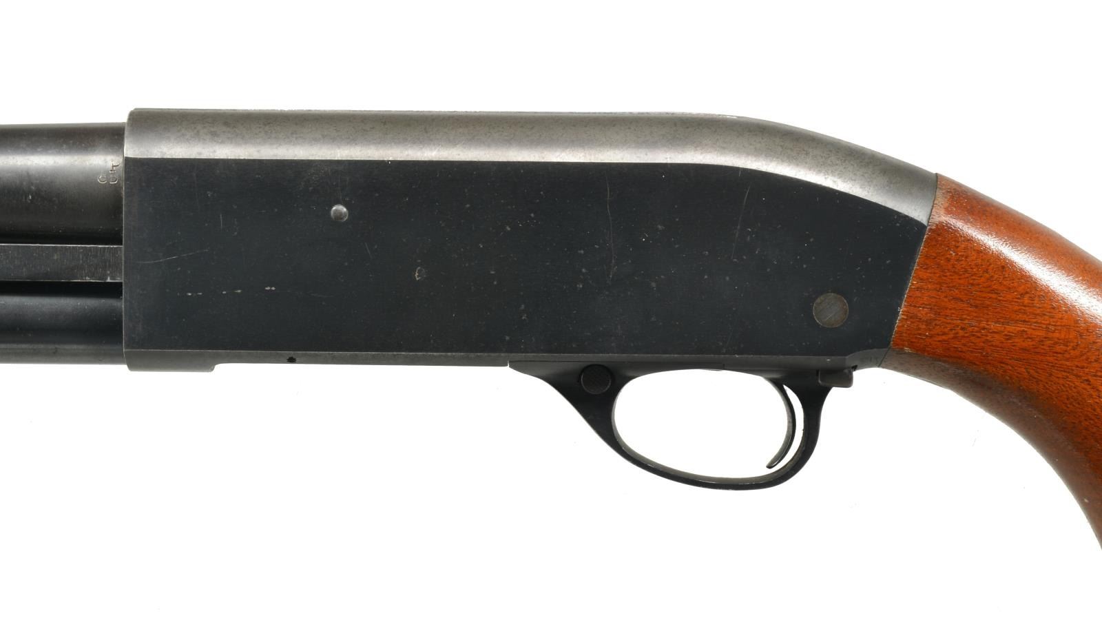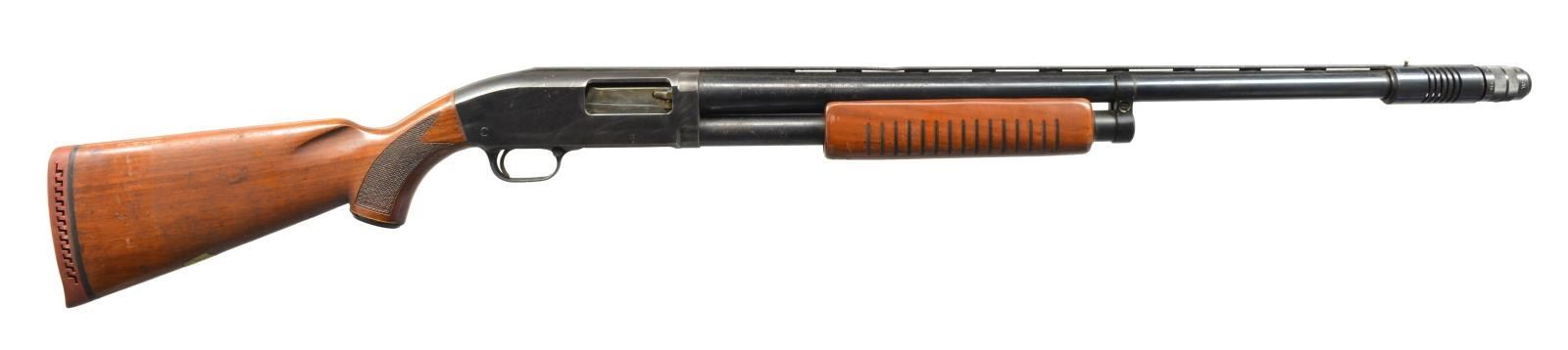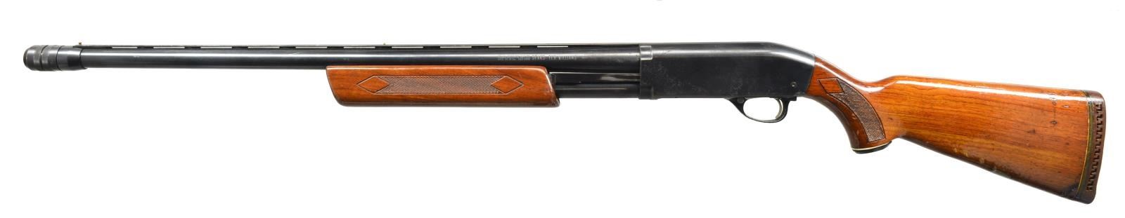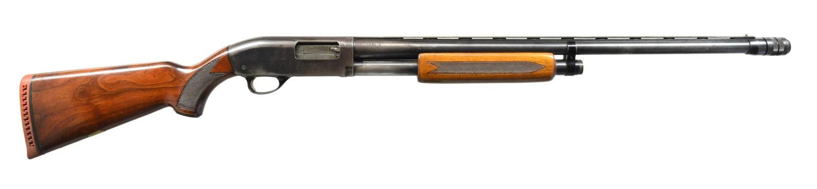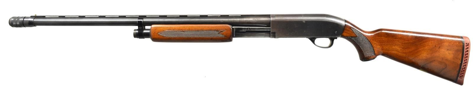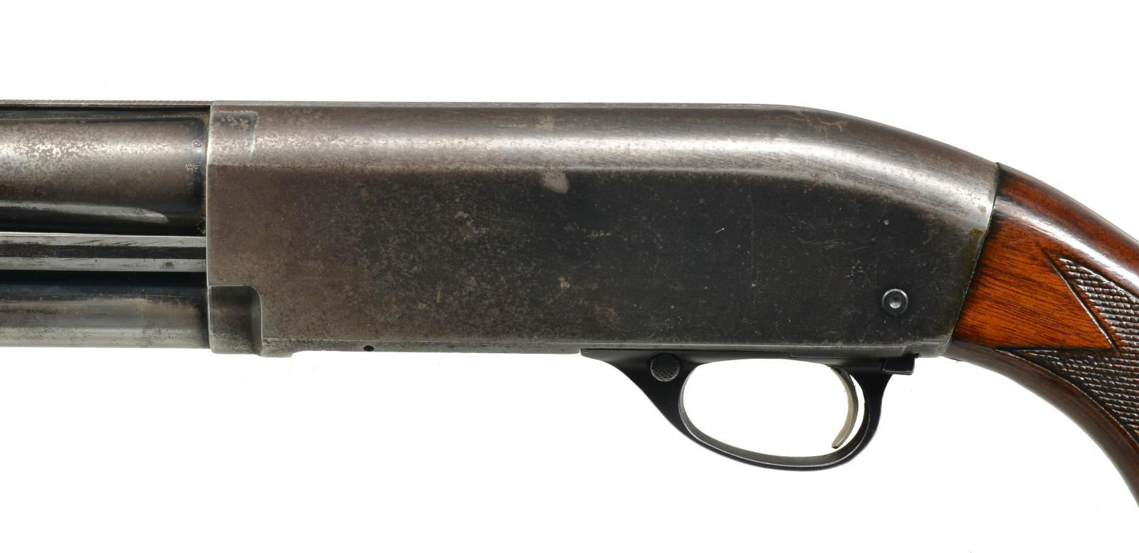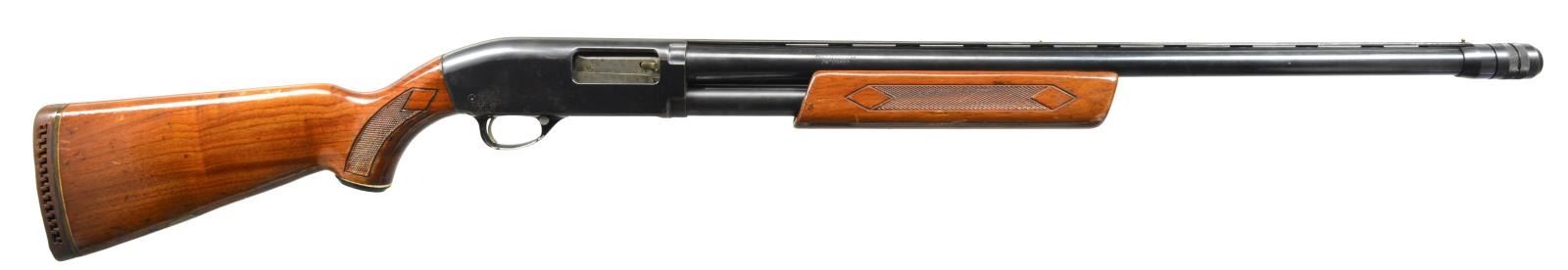 ALL: cal. 12 Ga., 2 3/4". NSN. All mfg. by High Standard. 1) JC HIGGINS MODEL 20. Bbl. 26 1/2" VR w/ ported adj. choke & brass bead. Blued steel action. Grooved walnut forearm & plastic capped pistol grip stock w/ checkered wrist, presentation plate on toeline & original recoil pad. CONDITION: 70% lightly worn blue showing areas of surface rust. Rib is bent between first & 2nd posts. Wood shows moderate wear w/ scratches, dents & handling marks. Very good bright bore. (20-2539/DS). 2) JC HIGGINS MODEL 20. Bbl. 26" plain over Cyclone Duo-vent adj. choke & brass bead. Blue finished steel action. Grooved walnut forearm & pistol grip stock w/ original buttplate. 80% Lightly faded blue w/ light pitting on top of receiver. Original wood finish shows scattered scratches & marks. Very good bright bore. (20-2540/DS). 3) SEARS/TED WILLIAMS MODEL 21. Bbl. 27" VR over adj. choke. Brass front & mid beads. Blued steel action w/ alloy trigger guard. Walnut forearm & plastic capped pistol grip stock w/ cut checkering. Name plate in toeline & original recoil pad. CONDITION: 80% blue showing scattered surface corrosion. Forearm is loose on iron. Stock has heavy coat of added finish over scratches, dents & marks. Very good bright bore. (20-2552/DS). 4) JC HIGGINS MODEL 20. Bbl. 26 1/2" plain over ventilated adj. choke w/ interchangeable tubes; Mod. tube included. Brass bead. Blued steel action w/ alloy trigger guard. Grooved walnut forearm & pistol grip stock w/ original buttplate. CONDITION: over 95% original blue. Stocks have very good finish. Very good bright bore. (20-2553/DS). 5) JC HIGGINS MODEL 20. Bbl. 27" VR over adj. choke. Brass front bead. Blued steel action w/ alloy trigger guard. Forearm & plastic caped pistol grip stock have cut checkering, nameplate in toeline & original buttpad. CONDITION: 60% dull faded blue showing areas of pitting. Wood has added finish over scratches & handling marks. Bore shows areas of very light pitting. (20-2563/DS). ALL CURIO. $750-1,250.