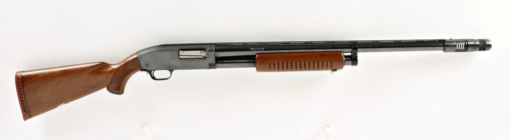 JC Higgins Mdl 20 12 ga SN:NVSNPump action shotgun with 26" vent rib barrel with J.C. Higgins adjustable choke system, blued finish with checkered pistol grip wood stock and grooved forearm, good bore and action.Condition: Very good showing light use, wood has small dings.