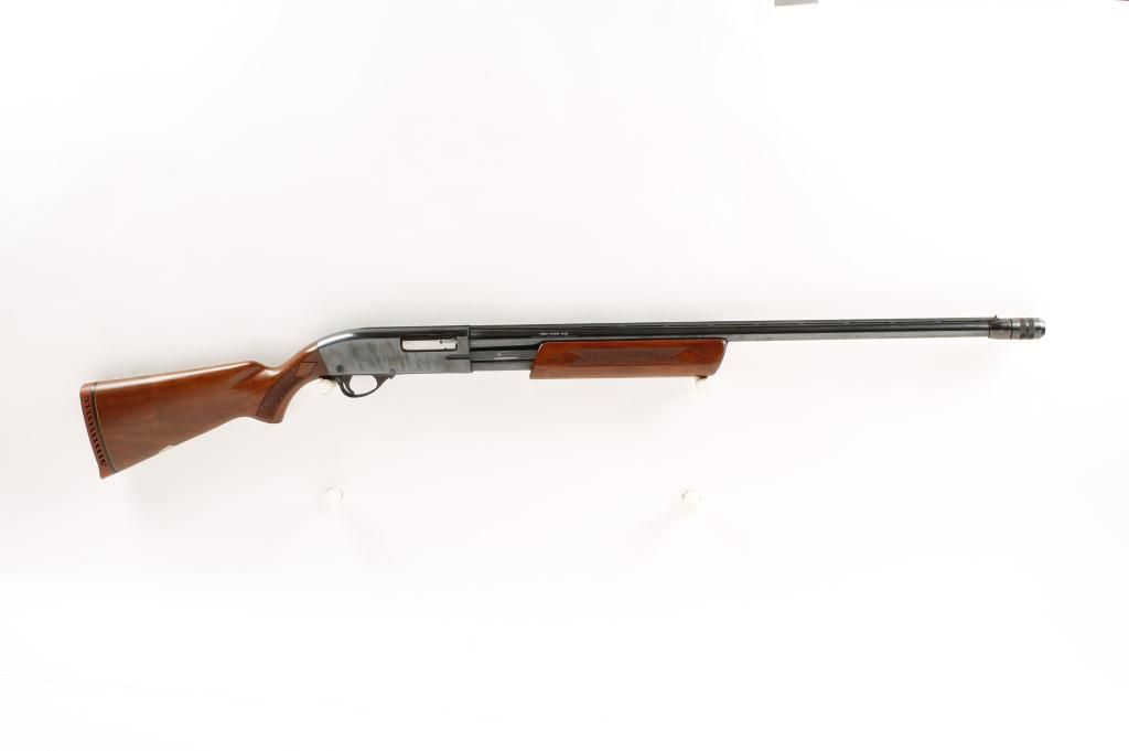 JC Higgins Mdl 21 20 ga SN:NVSNMade by High Standard, pump action hammerless shotgun, matte black finished alloy trigger guard, all other metal is blued steel, adjustable choke, 27" barrel, single bead sight, chambered for 2.75" and 3" shells,metal finish shows edge wear on trigger guard, wear on action slide, checkered wood forend and butt stock, red rubber recoil pad with black spacer, engravable plate in belly of stock, wood shows dings/rubs/gouges, goodbore and action. Condition: Good.