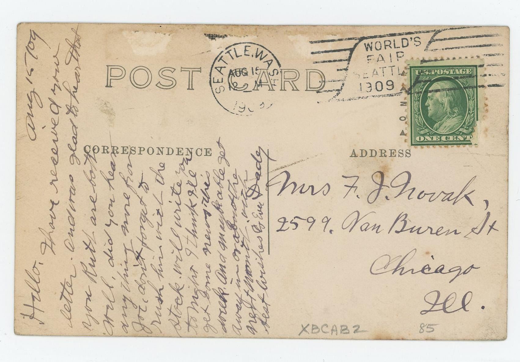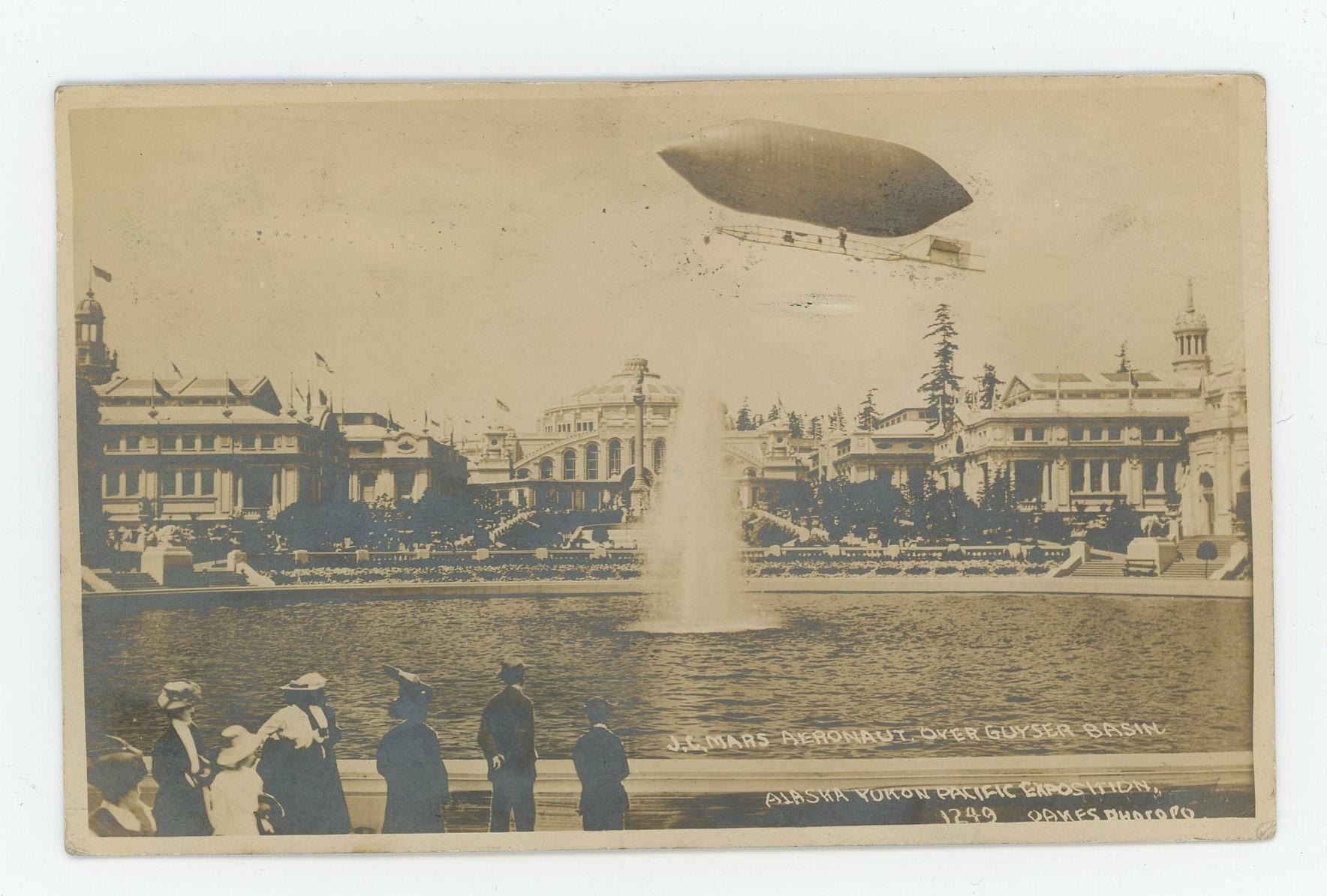 This postcard depicts JC 'Bud' Mars flying over part of the University of Washington Campus as part of the Alaska Yukon Pacific Exposition, a worlds fair held in Seattle in 1909.