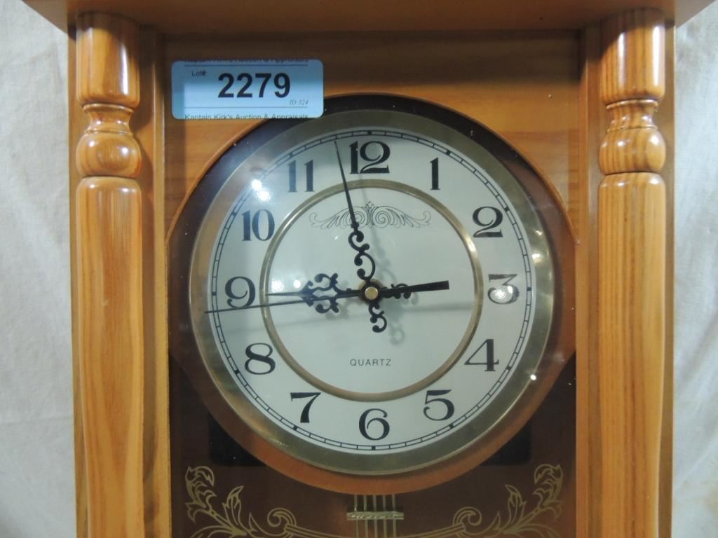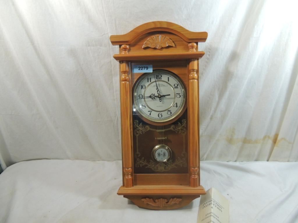 VINTAGE WALL CLOCK, WOODEN WALL CLOCK, QUARTZ CHIME CLOCK, AS SHOWN SEE PHOTO FOR MORE DETAILS.