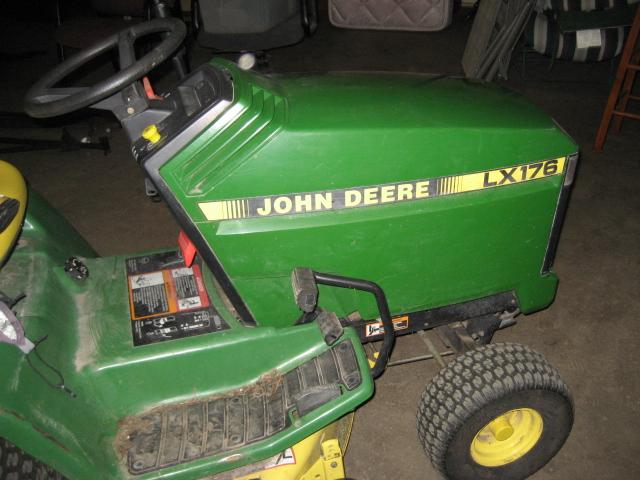 John Deere Model LX176 riding mower with 38" deck. Hydro. needs one headlight runs and mows real good.