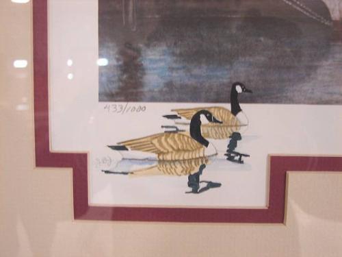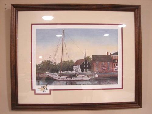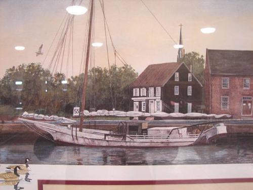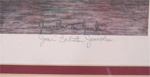 JEAN BRINTON JAECKS BOAT PRINT. Depicts a skip jack in harbor. Signed in lower right. Numbered in lower left “433/1000”. 30.75” x 24.5” framed